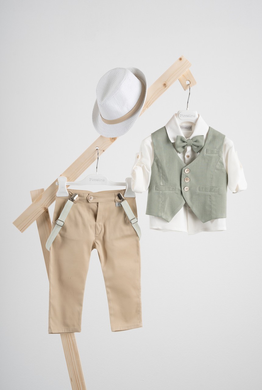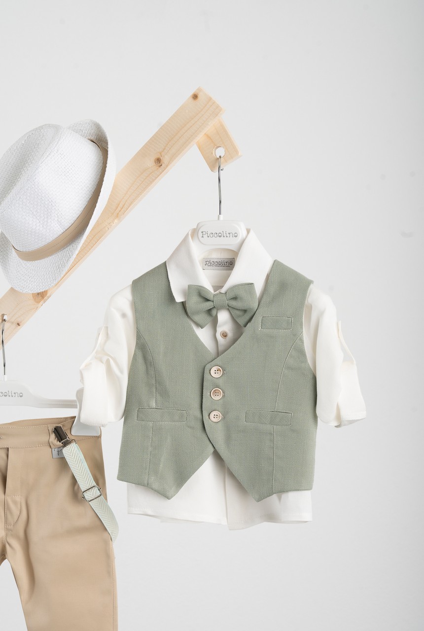 Βαπτιστικό κοστούμι 6 τεμαχίων Piccolino Bob σε χρώμα Mint. Περιλαμβάνει κλασάτο γιλέκο βαμβακερό σε mint απόχρωση με μελανζέ λεπτομέρειες στην ύφανση, πουκάμισο λινό εκρού, παντελόνι βαμβακερό σε μπεζ χρώμα, παπιγιόν, φουλάρι, τιράντες και καπέλο με φάσα. Διαθέσιμο σε 4 μεγέθη 6-12, 12-18, 18-24, 24-36 (εξτρά χρέωση)