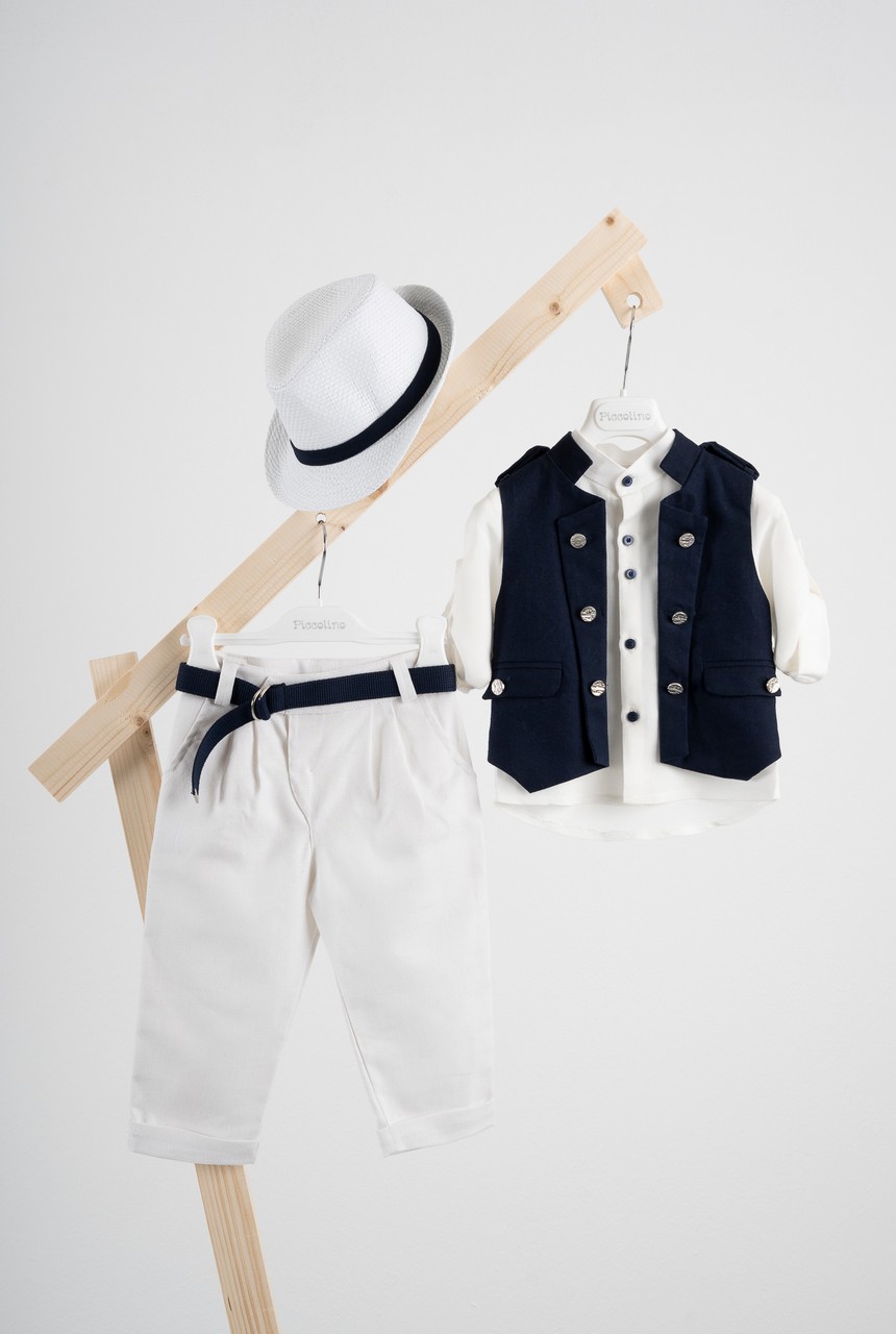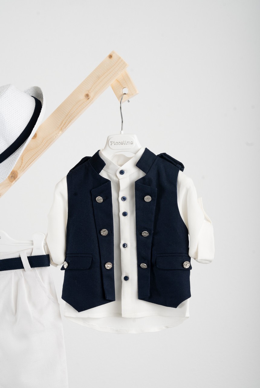 Βαπτιστικό κοστούμι Piccolino Che σε χρώμα Blue. Περιλαμβάνει military, λινό, γιλέκο με διακοσμητικά μεταλικά κουμπια , πουκάμισο mao λινό εκρού, παντελόνι λινό βράκα με πιέτες, ζώνη και καπέλο με φάσα. Διαθέσιμο σε 4 μεγέθη 6-12, 12-18, 18-24, 24-36 (εξτρά χρέωση)