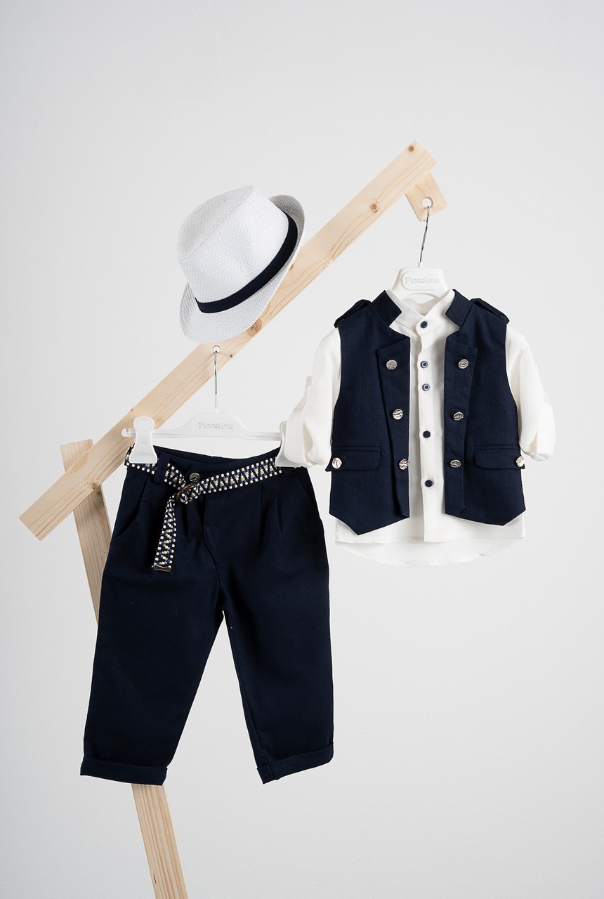 Βαπτιστικό κοστούμι Piccolino Che σε χρώμα Total Blue. Περιλαμβάνει military, λινό, γιλέκο με διακοσμητικά μεταλικά κουμπια , πουκάμισο mao λινό εκρού, παντελόνι λινό βράκα με πιέτες, ζώνη και καπέλο με φάσα. Διαθέσιμο σε 4 μεγέθη 6-12, 12-18, 18-24, 24-36 (εξτρά χρέωση)