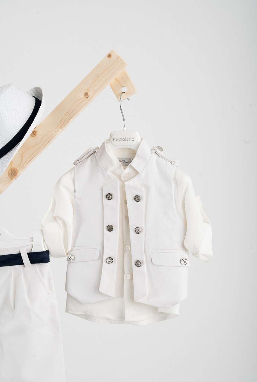 Βαπτιστικό κοστούμι Piccolino Che σε χρώμα Total Off White. Περιλαμβάνει military, λινό, γιλέκο με διακοσμητικά μεταλικά κουμπια , πουκάμισο mao λινό εκρού, παντελόνι λινό βράκα με πιέτες, ζώνη και καπέλο με φάσα. Διαθέσιμο σε 4 μεγέθη 6-12, 12-18, 18-24, 24-36 (εξτρά χρέωση)