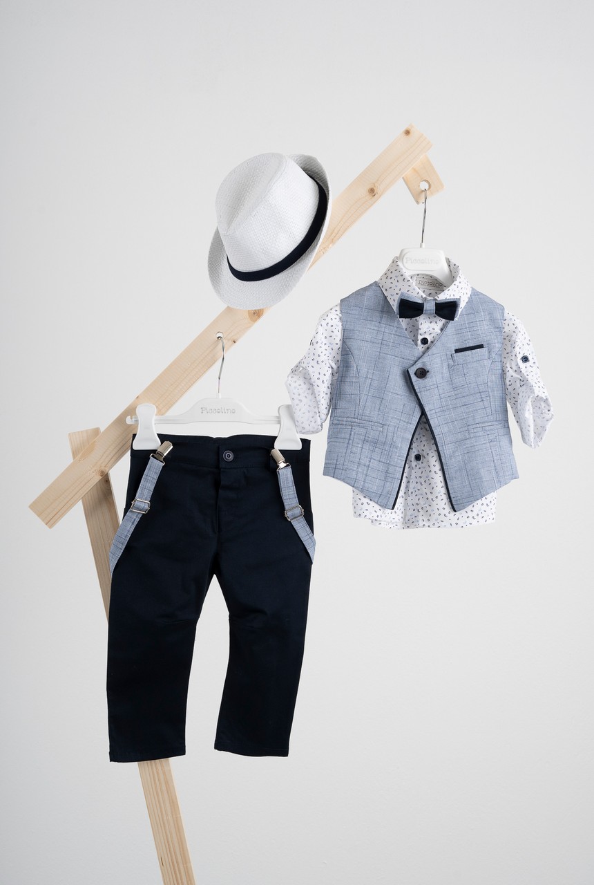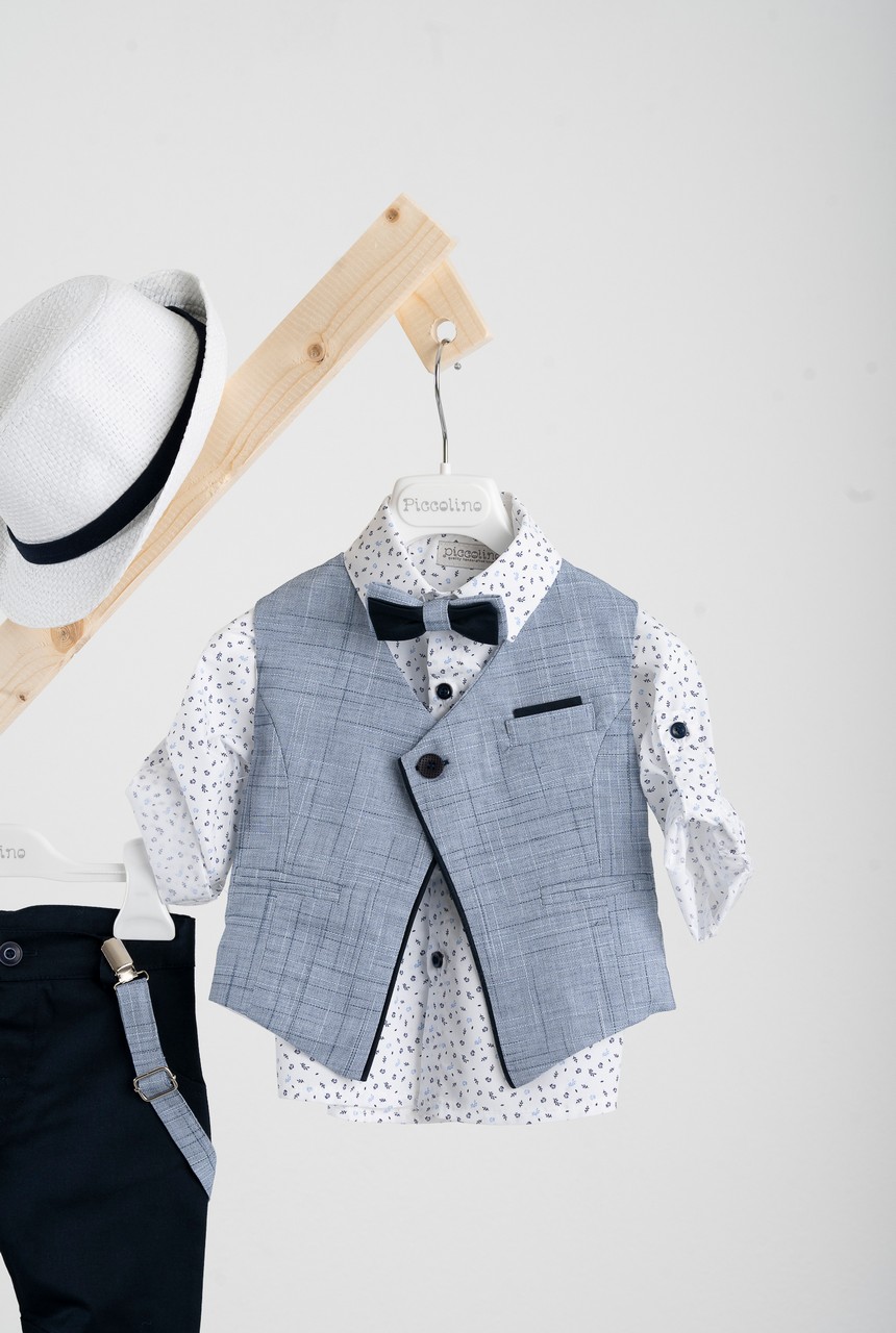 Βαπτιστικό κοστούμι Piccolino Didler σε χρώμα Blue. Περιλαμβάνει κλασάτο σταυρωτό γιλέκο μονόκουμπο με λοξάδα, πουκάμισο βαμβακερό, παντελόνι βαμβακερό σε χρώμα Blue, διπλο παπιγιόν, τιράντες και καπέλο με φάσα. Διαθέσιμο σε 4 μεγέθη 6-12, 12-18, 18-24, 24-36 (εξτρά χρέωση)