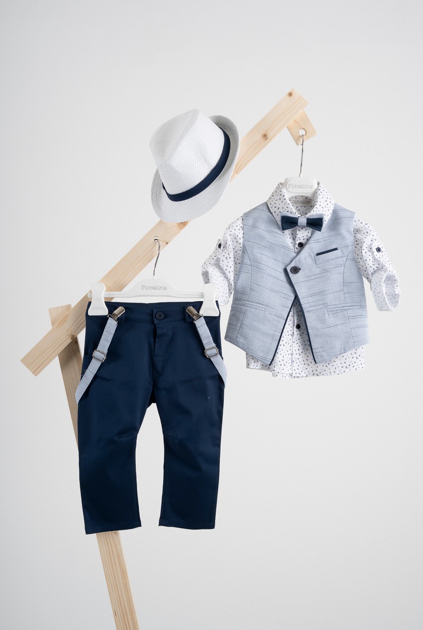 Βαπτιστικό κοστούμι Piccolino Didler σε χρώμα Navy. Περιλαμβάνει κλασάτο σταυρωτό γιλέκο μονόκουμπο με λοξάδα, πουκάμισο βαμβακερό, παντελόνι βαμβακερό σε χρώμα Navy, διπλο παπιγιόν, τιράντες και καπέλο με φάσα. Διαθέσιμο σε 4 μεγέθη 6-12, 12-18, 18-24, 24-36 (εξτρά χρέωση)