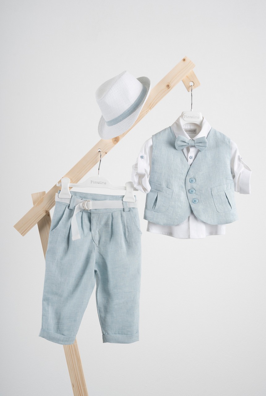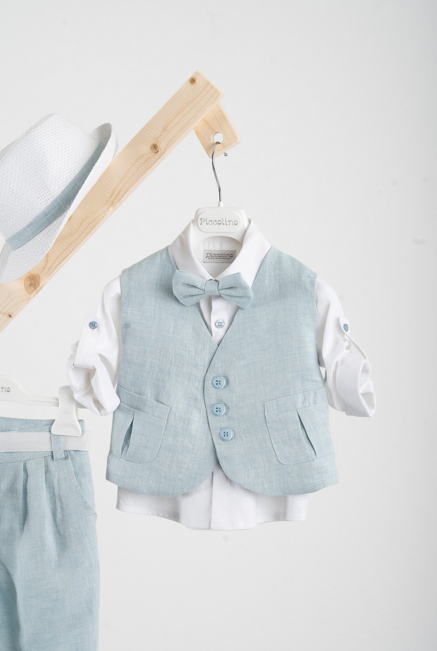 Βαπτιστικό κοστούμι Piccolino Emanuel σε χρώμα Ciele. Περιλαμβάνει λινό γιλέκο καμπυλόγραμμο, πουκάμισο λινό, παντελόνι λινό βράκα με πιέτες σε χρώμα ciele, υαφασμάτινο παπιγιόν, ζώνη με double D δέσιμο και καπέλο με φάσα. Διαθέσιμο σε 4 μεγέθη 6-12, 12-18, 18-24, 24-36 (εξτρά χρέωση)