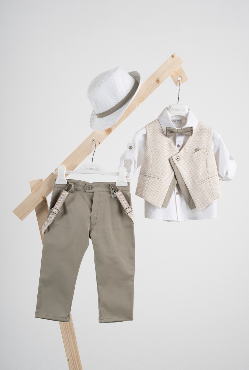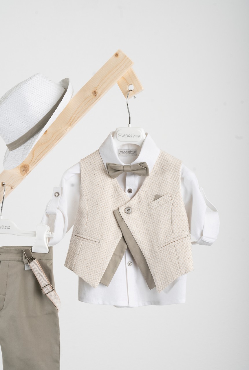 Βαπτιστικό κοστούμι Piccolino Felipe σε χρώμα Sage. Περιλαμβάνει κλασάτο σταυρωτό γιλέκο μονόκουμπο με διπλή λοξάδα σε διχρωμία, πουκάμισο λινό, παντελόνι βαμβακερό σε χρώμα sage, παπιγιόν μιας κατεύθυνσης με μύτη στο τελείωμα, τιράντες και καπέλο με φάσα. Διαθέσιμο σε 4 μεγέθη 6-12, 12-18, 18-24, 24-36 (εξτρά χρέωση)