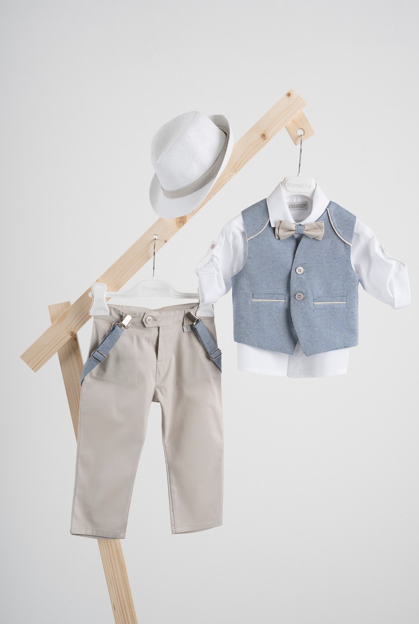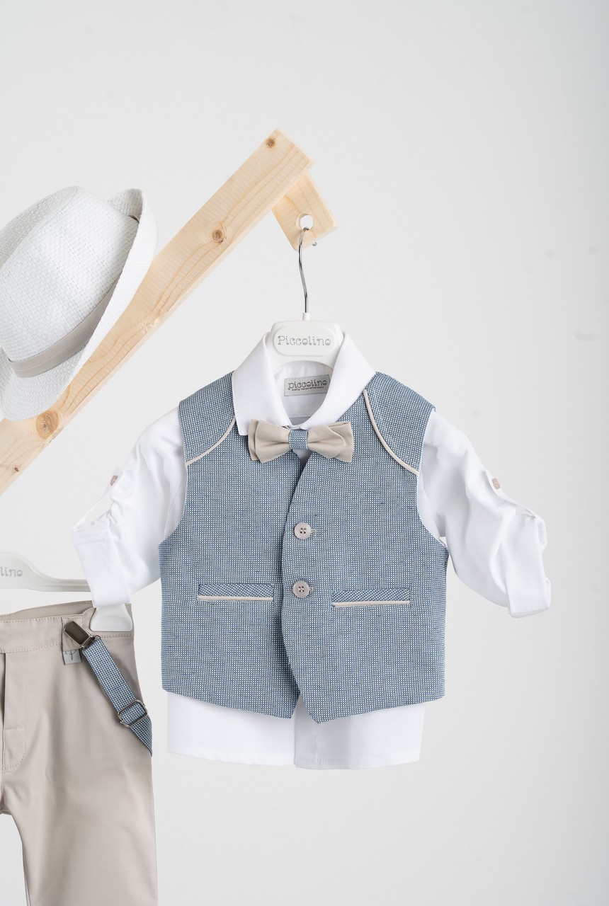 Βαπτιστικό κοστούμι Piccolino Francisco σε χρώμα Blue-Sand. Περιλαμβάνει δίχρωμο γιλέκο με διακοσμητικούς ωμίτες, πουκάμισο βαμβακερό λευκό, παντελόνι βαμβακερό σε χρώμα sand, παπιγιόν με διχρωμία, ζώνη με double D δέσιμο και καπέλο με φάσα. Διαθέσιμο σε 4 μεγέθη 6-12, 12-18, 18-24, 24-36 (εξτρά χρέωση)