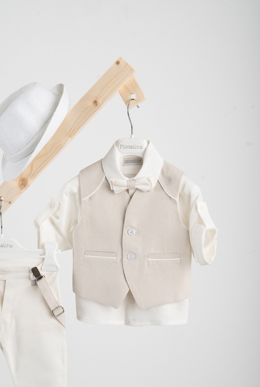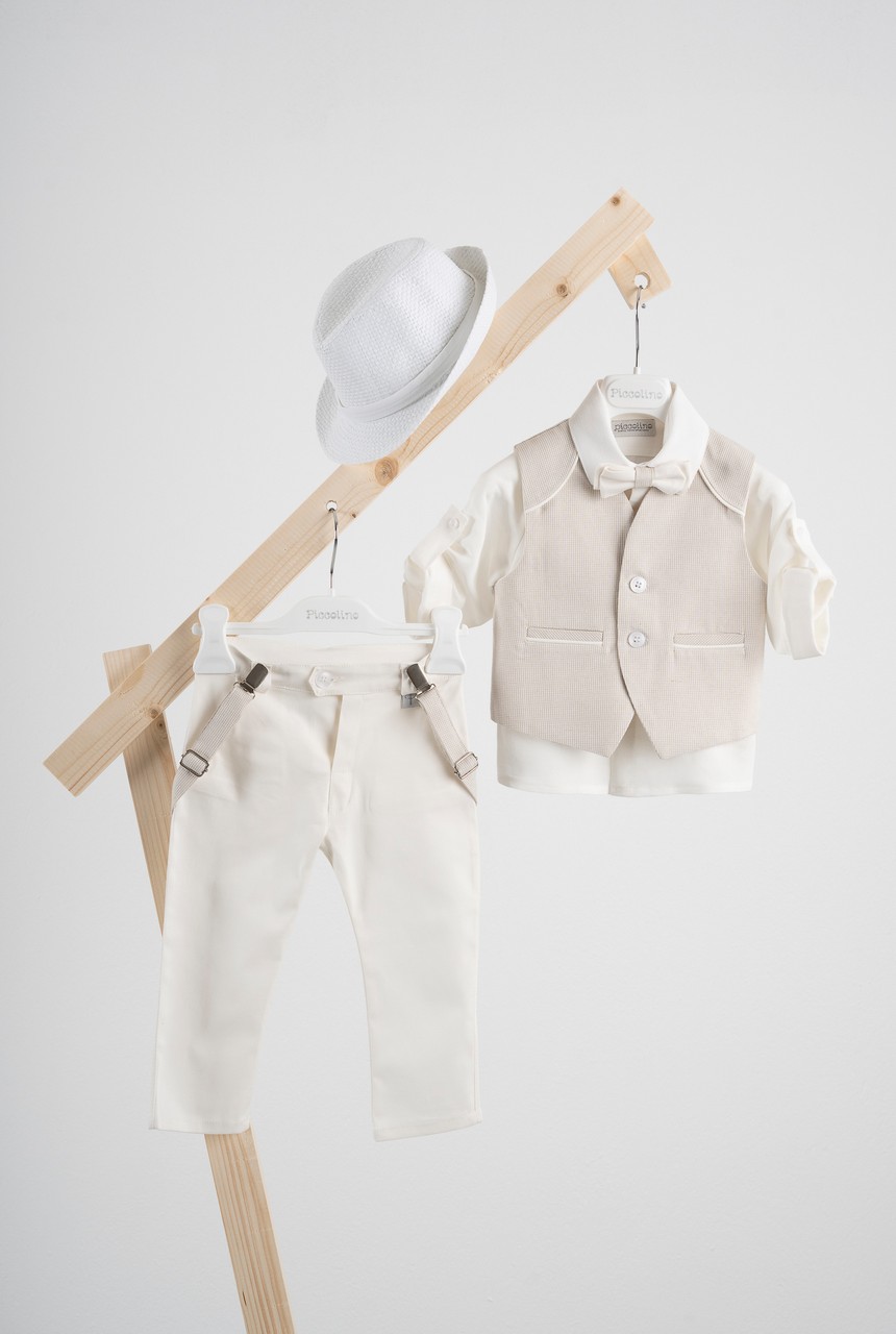Βαπτιστικό κοστούμι Piccolino Francisco σε χρώμα Ivory. Περιλαμβάνει δίχρωμο γιλέκο με διακοσμητικούς ωμίτες, πουκάμισο λινό εκρού, παντελόνι βαμβακερό σε χρώμα ivory, παπιγιόν με διχρωμία, ζώνη με double D δέσιμο και καπέλο με φάσα. Διαθέσιμο σε 4 μεγέθη 6-12, 12-18, 18-24, 24-36 (εξτρά χρέωση)