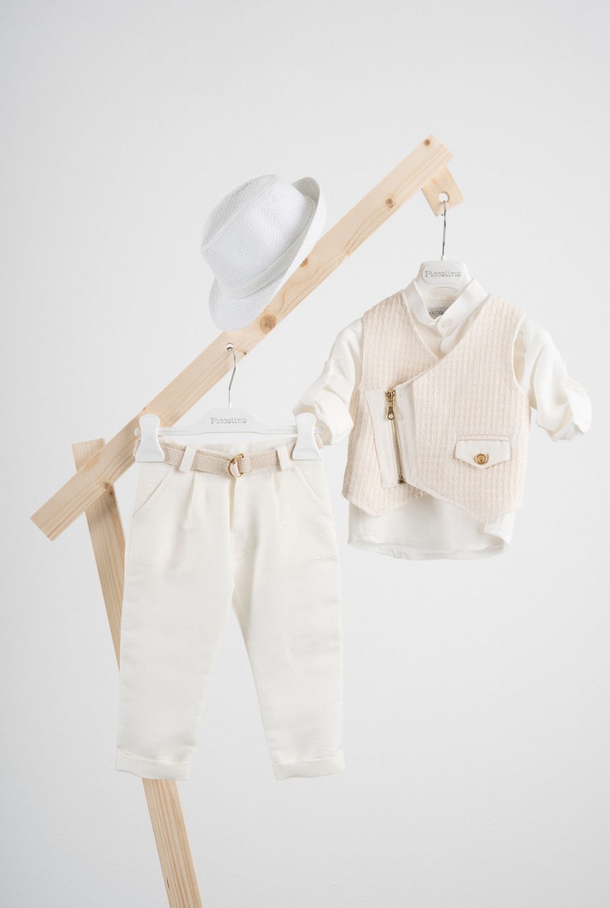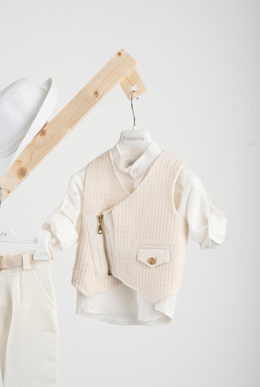 Βαπτιστικό κοστούμι Piccolino Furilo σε χρώμα Ivory. Περιλαμβάνει γιλέκο με ιδιαίτερο κόψιμο σε ιβουάρ χρώμα με φερμουάρ σε χρυσή απόχρωση και χρυσό διακοσμητικό κουμπί στο τσεπάκι , λινό πουκάμισο ιβουάρ με μάο γιακά, λινό παντελόνι με πιέτες ιβουάρ, ζώνη και καπέλο με φάσα. Διαθέσιμο σε 4 μεγέθη 6-12, 12-18, 18-24, 24-36 (εξτρά χρέωση)