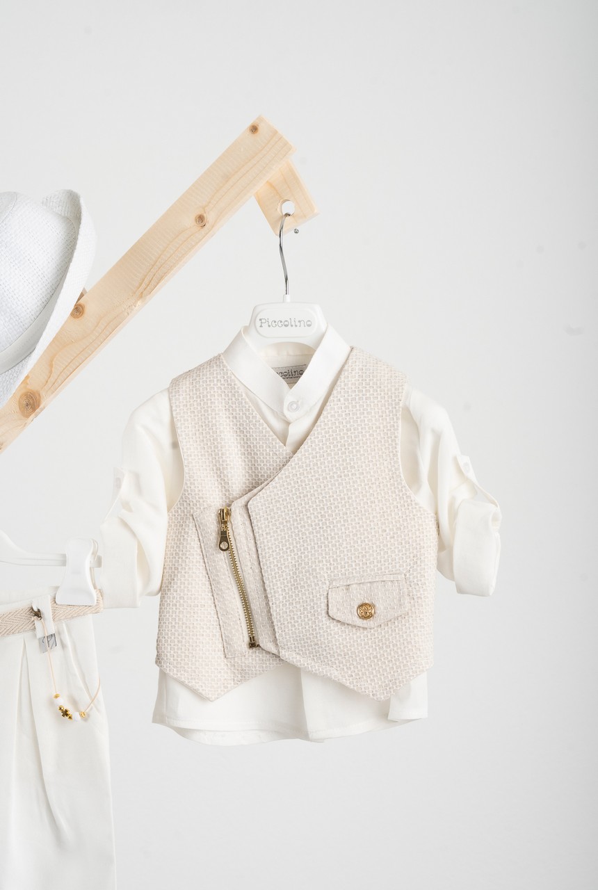 Βαπτιστικό κοστούμι Piccolino Furilo σε χρώμα Off White. Περιλαμβάνει γιλέκο με ιδιαίτερο κόψιμο με φερμουάρ σε χρυσή απόχρωση και χρυσό διακοσμητικό κουμπί στο τσεπάκι , λινό πουκάμισο ιβουάρ με μάο γιακά, παντελόνι λινό βράκα με πιέτες off white με διακοσμητικό κρεμαστό με χάντρες, ζώνη και καπέλο με φάσα. Διαθέσιμο σε 4 μεγέθη 6-12, 12-18, 18-24, 24-36 (εξτρά χρέωση)