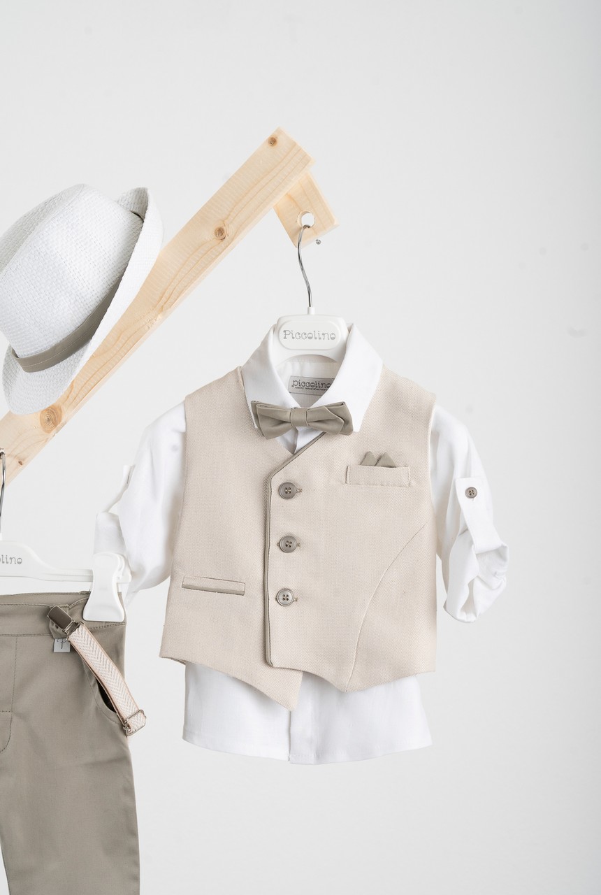 Βαπτιστικό κοστούμι Piccolino Gustavo σε χρώμα Sage. Περιλαμβάνει γιλέκο asia style σε μπεζ ΄΄ψαροκόκκαλο΄΄, πουκάμισο βαμβακερό λευκό, παντελόνι βαμβακερό σε χρώμα Sage, παπιγιόν μιας κατεύθυνσης με μύτη στο τελείωμα, τιράντες και καπέλο με φάσα. Διαθέσιμο σε 4 μεγέθη 6-12, 12-18, 18-24, 24-36 (εξτρά χρέωση)