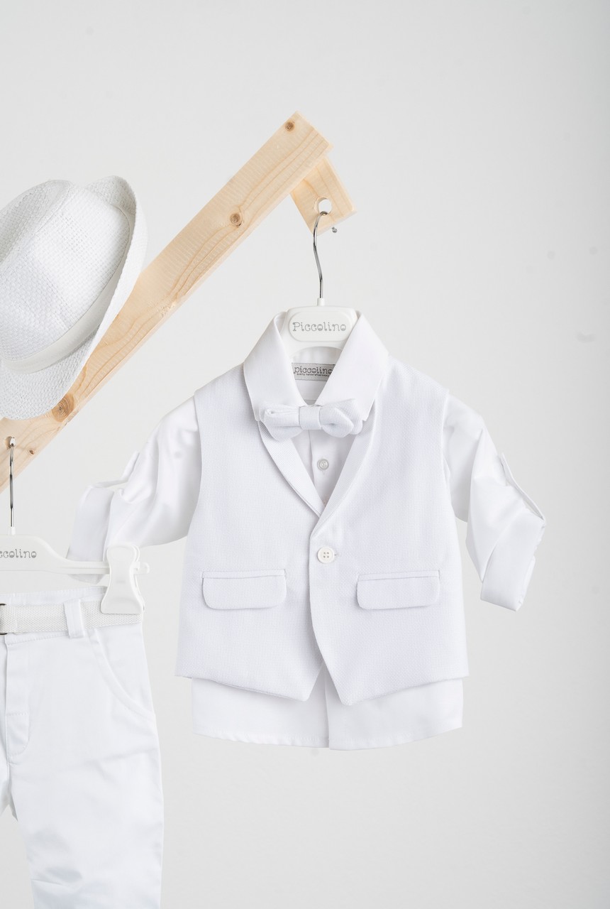 Βαπτιστικό κοστούμι Piccolino Ian σε χρώμα white. Περιλαμβάνει γιλέκο μονόκουμπο με πετάκι, πουκάμισο βαμβακερό λευκό, παντελόνι σε χρώμα white, παπιγιόν, ζώνη με double D δέσιμο και καπέλο με φάσα. Διαθέσιμο σε 4 μεγέθη 6-12, 12-18, 18-24, 24-36 (εξτρά χρέωση)