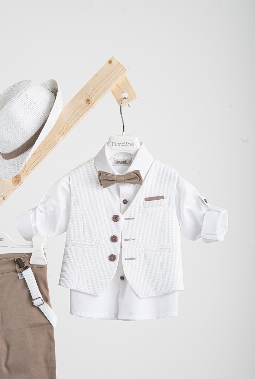 Βαπτιστικό κοστούμι Piccolino Lorenzo σε χρώμα Mocha. Περιλαμβάνει λευκό γιλέκο, πουκάμισο βαμβακερό λευκό, παντελόνι βαμβακερό σε χρώμα mocha, παπιγιόν μιας κατεύθυνσης με μύτη στο τελείωμα, τιράντες και καπέλο με φάσα. Διαθέσιμο σε 4 μεγέθη 6-12, 12-18, 18-24, 24-36 (εξτρά χρέωση)