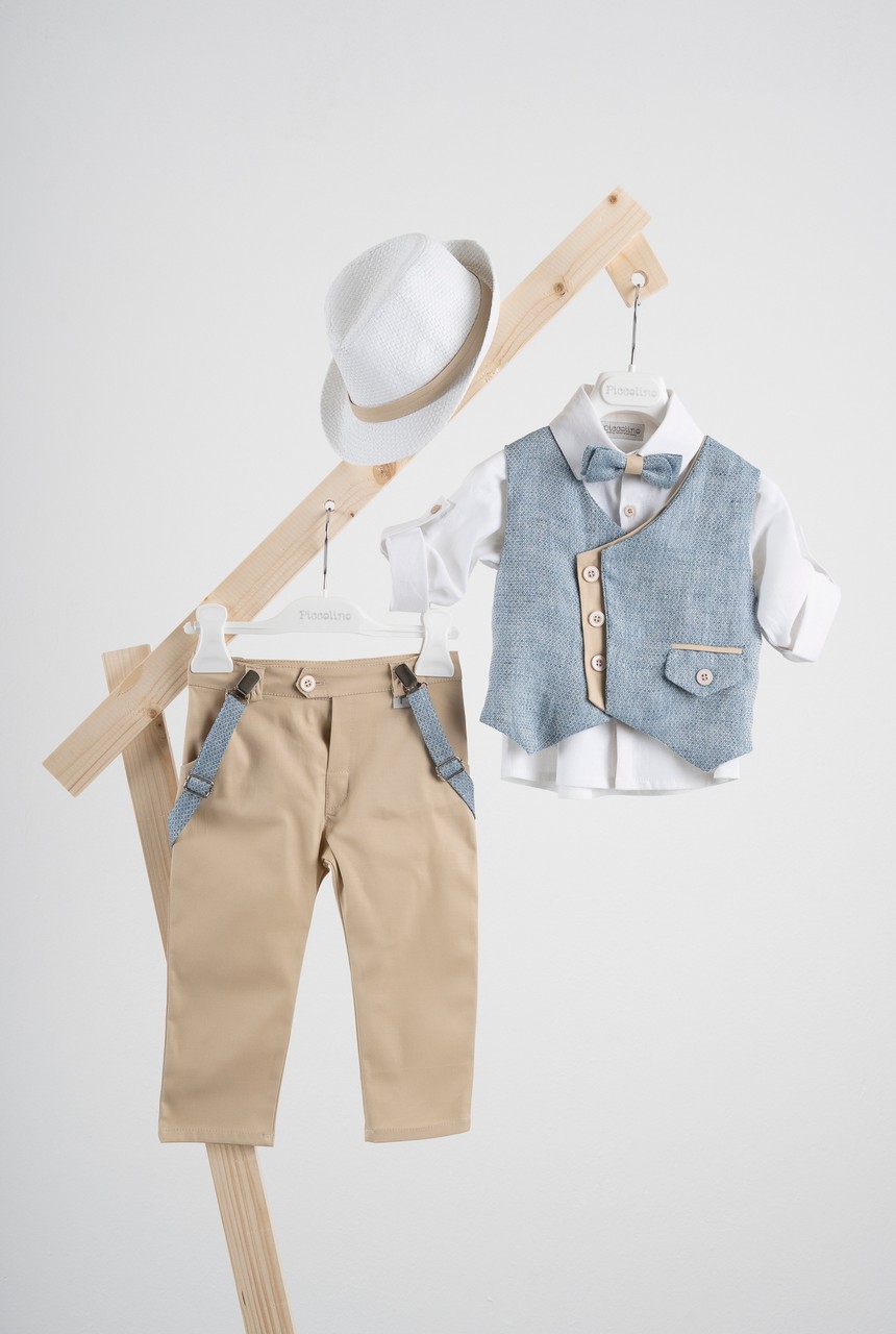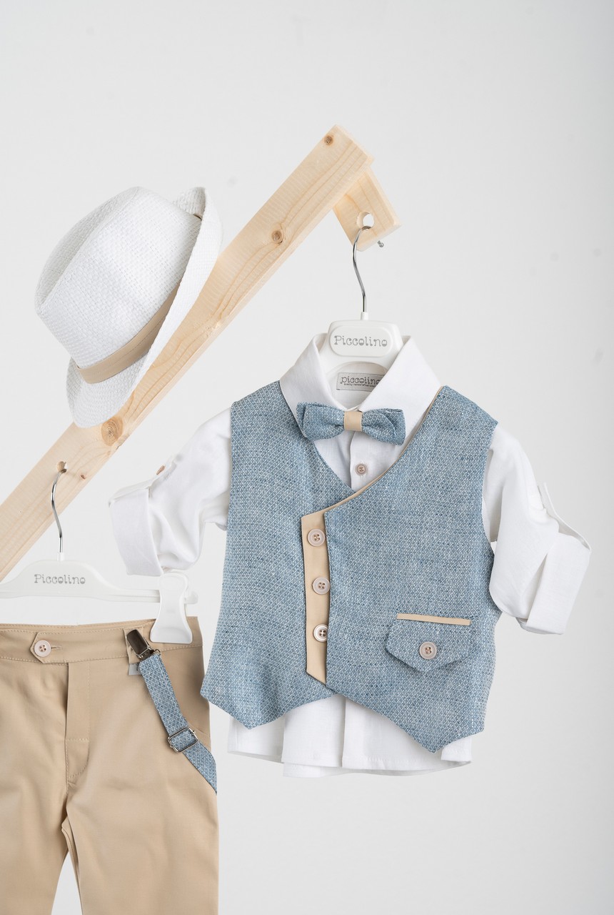 Βαπτιστικό κοστούμι 6 τεμαχίων Piccolino Pedro σε χρώμα Beige. Περιλαμβάνει γιλέκο με διπλή μόστρα σε διχρωμία, πουκάμισο λινό εκρού, παντελόνι σε χρώμα Beige, παπιγιόν, τιράντες και καπέλο με φάσα. Διαθέσιμο σε 4 μεγέθη 6-12, 12-18, 18-24, 24-36 (εξτρά χρέωση)