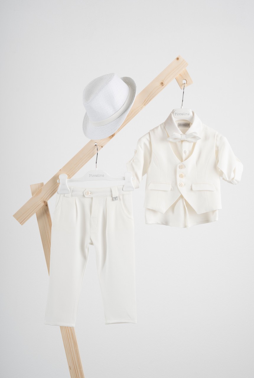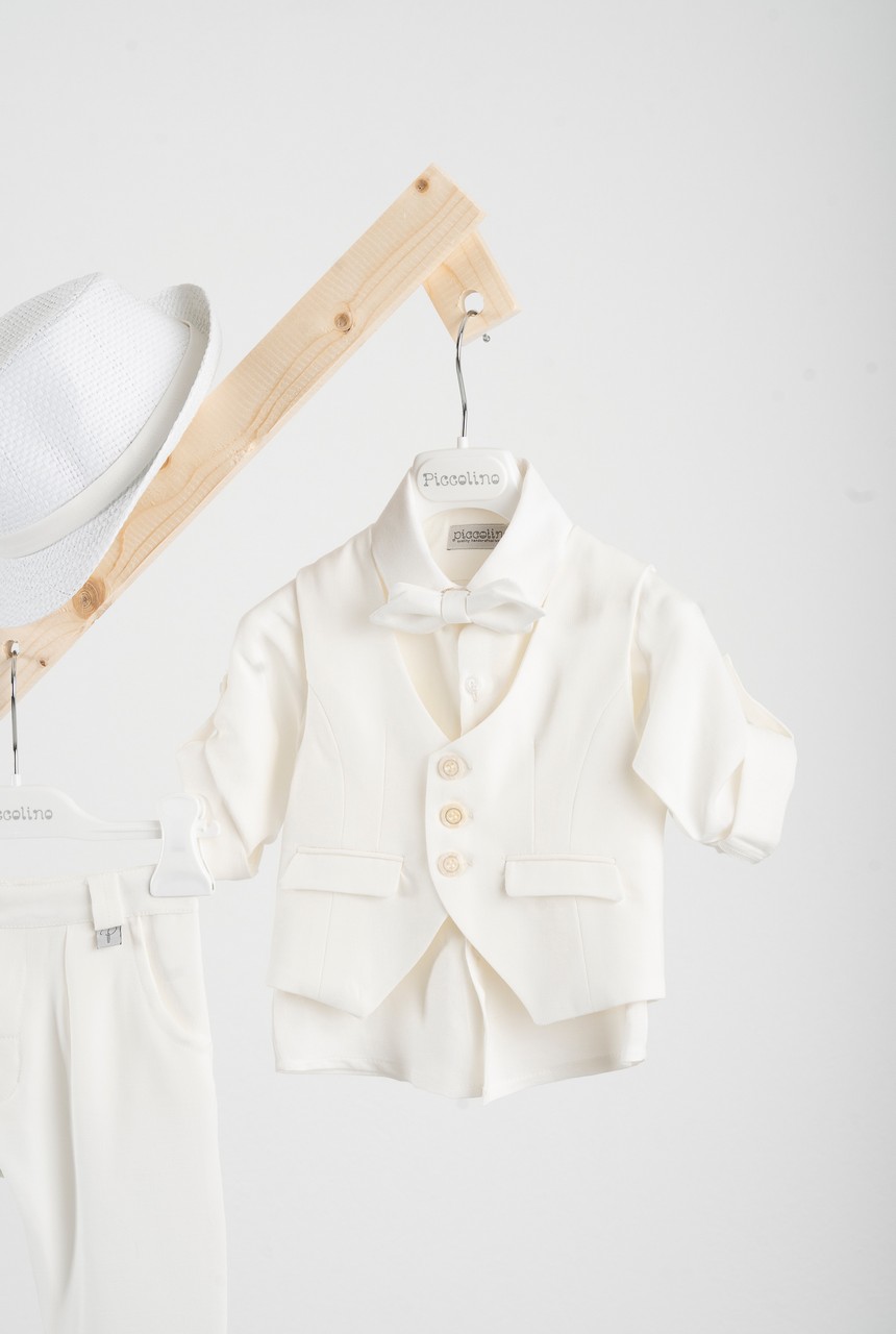 Βαπτιστικό κοστούμι Piccolino Rodrigo σε χρώμα Ivory. Περιλαμβάνει κλασάτο γιλέκο, πουκάμισο λινό, παντελόνι σε χρώμα ivory με πιέτες, παπιγιόν διπλό με μύτες και καπέλο με φάσα. Διαθέσιμο σε 4 μεγέθη 6-12, 12-18, 18-24, 24-36 (εξτρά χρέωση)