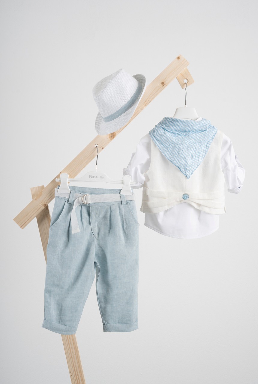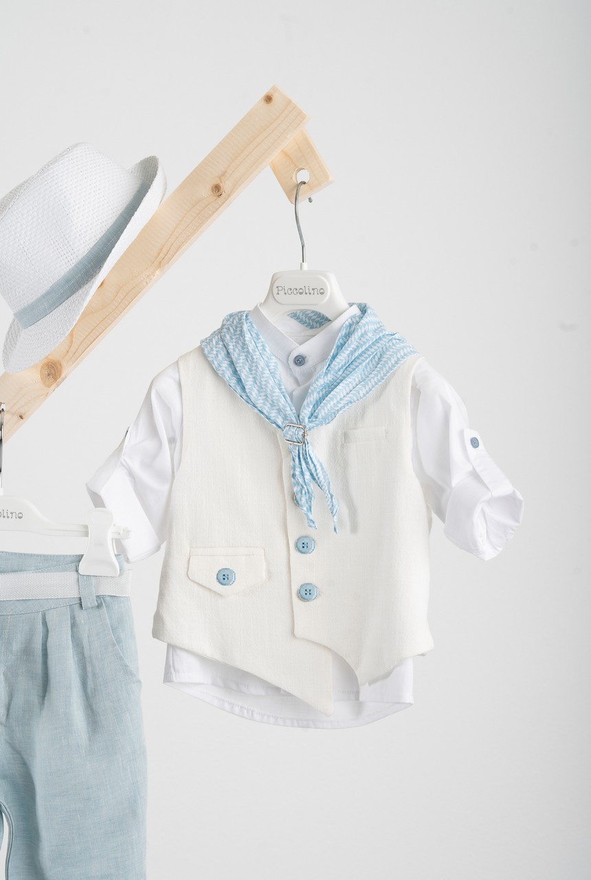 Βαπτιστικό κοστούμι 7 τεμαχίων Piccolino Thomas σε χρώμα Ciele. Περιλαμβάνει λινό γιλέκο λοξό με μύτες, πουκάμισο με γιακά μαο λινό εκρού, παντελόνι βράκα με πιέτες λινό σε χρώμα ciele, φουλάρι, ζώνη και καπέλο με φάσα. Διαθέσιμο σε 4 μεγέθη 6-12, 12-18, 18-24, 24-36 (εξτρά χρέωση)