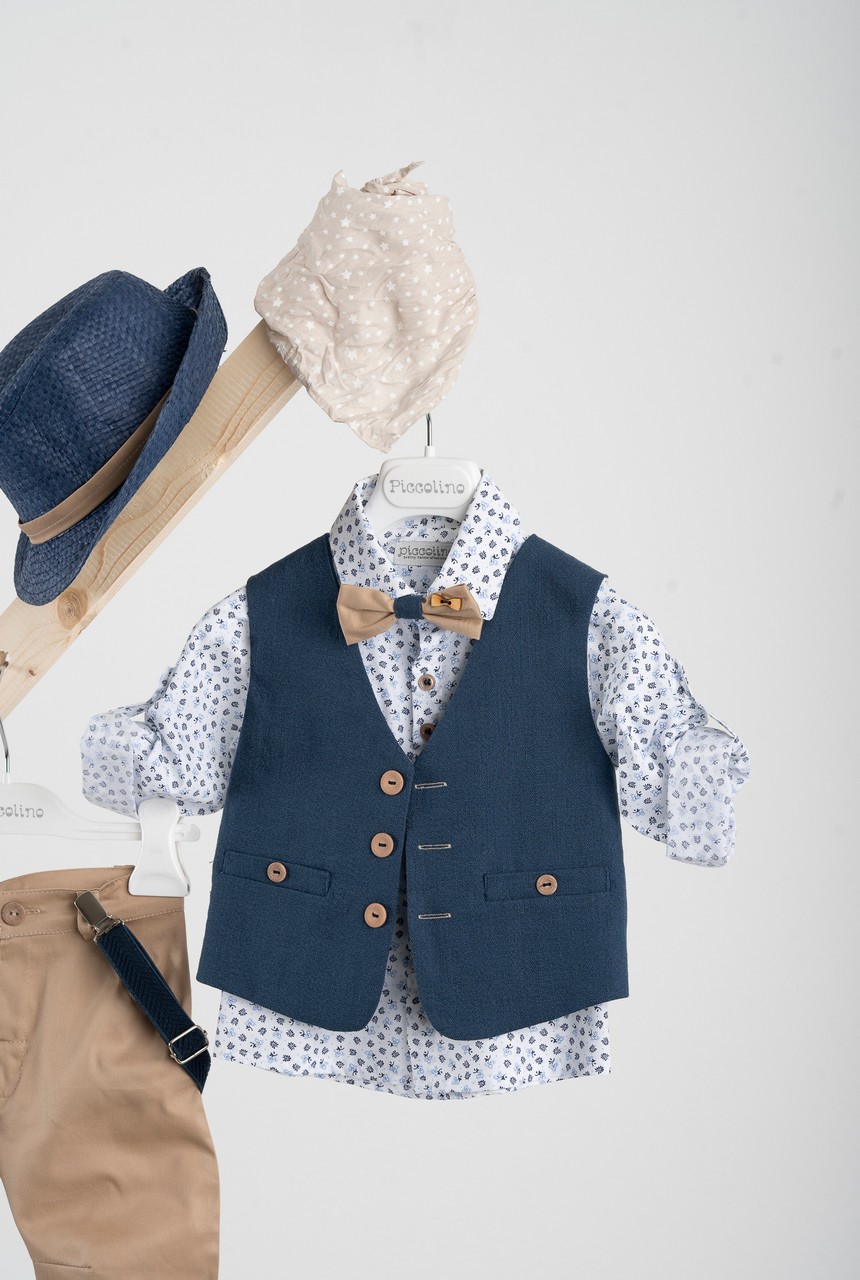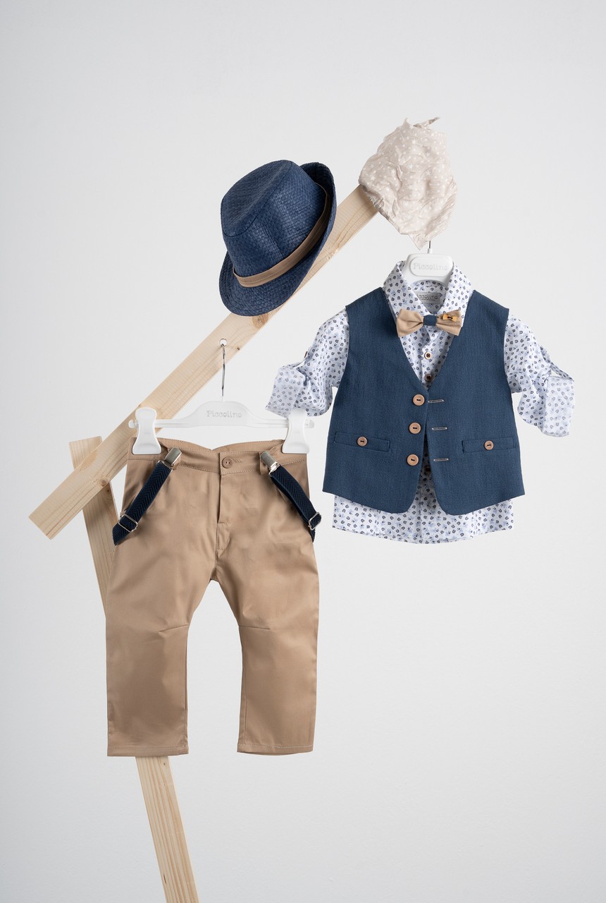 Βαπτιστικό κοστούμι Piccolino Tony σε χρώμα Safari. Περιλαμβάνει μπλε μπεζ, πουκάμισο βαμβακερό λευκό με σχέδια, παντελόνι βαμβακερό σε χρώμα safari, παπιγιόν με ξύλινη λεπτομέρεια, τιράντες και καπέλο με φάσα. Διαθέσιμο σε 4 μεγέθη 6-12, 12-18, 18-24, 24-36 (εξτρά χρέωση)