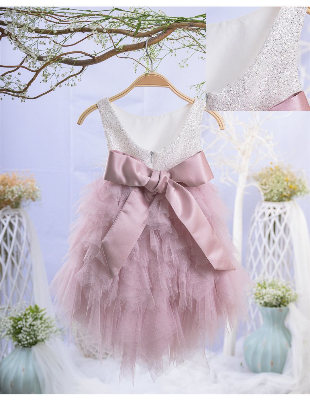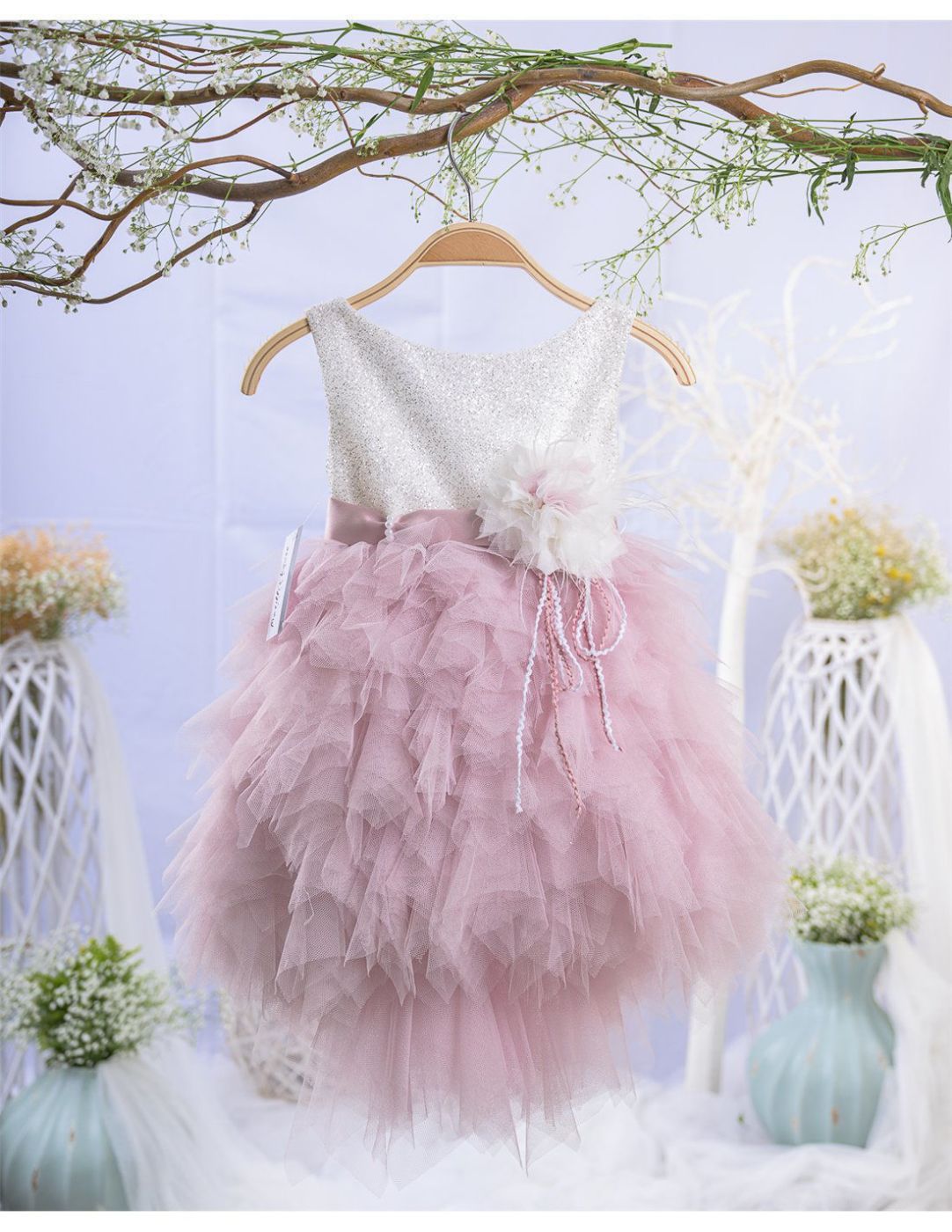 Εντυπωσιακό βαπτιστικό φόρεμα με λαμπερό μπουστο κεντημένο με παγιέτες στις αποχρώσεις του ρόζ-σάπιο μήλο