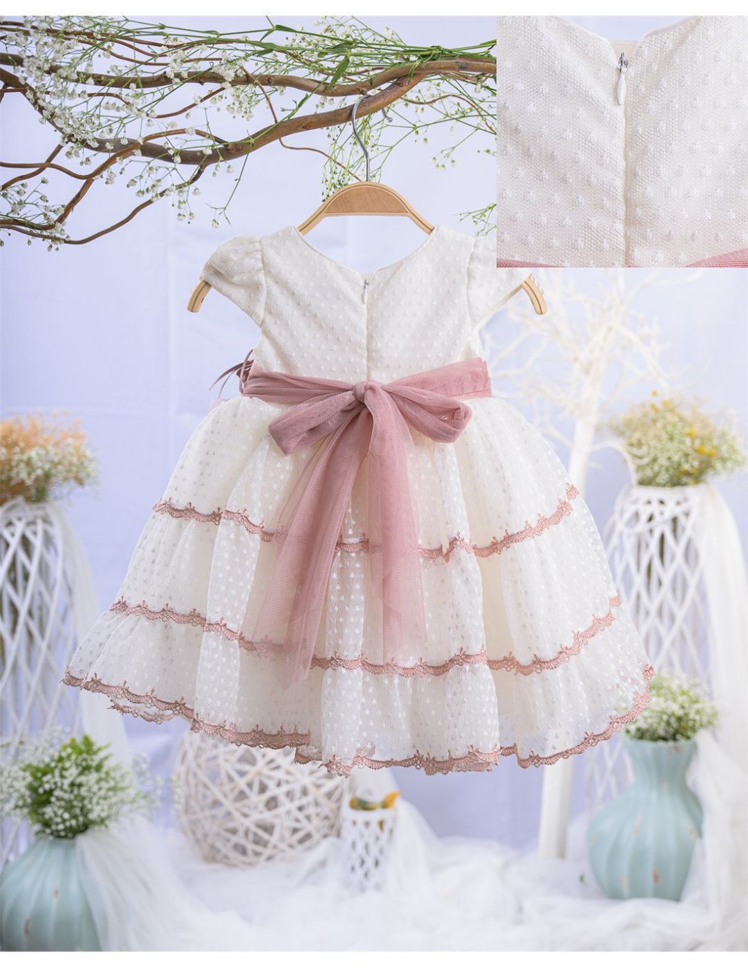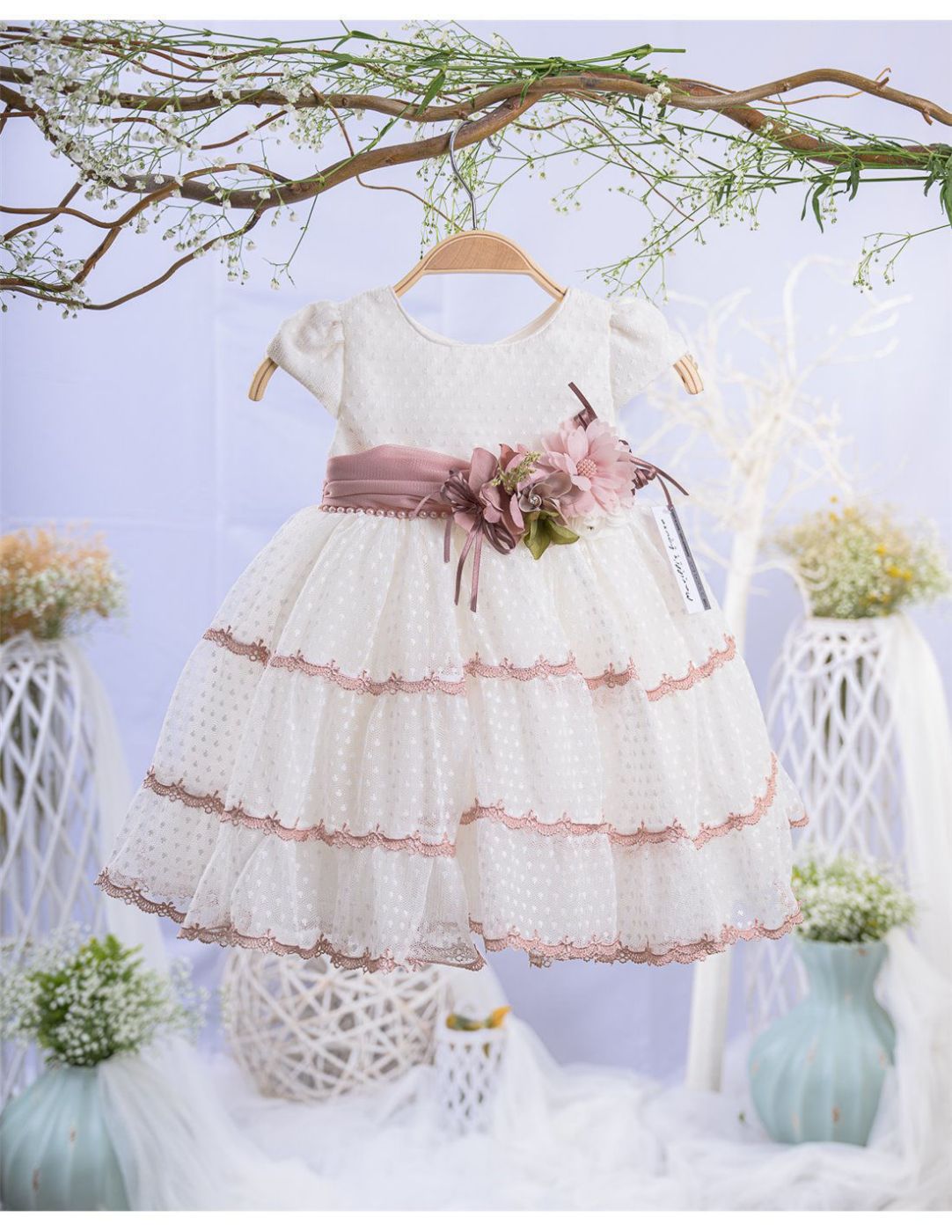 Βαπτιστικό φόρεμα σε ιβουάρ, ροζ και dusty pink αποχρώσεις.
