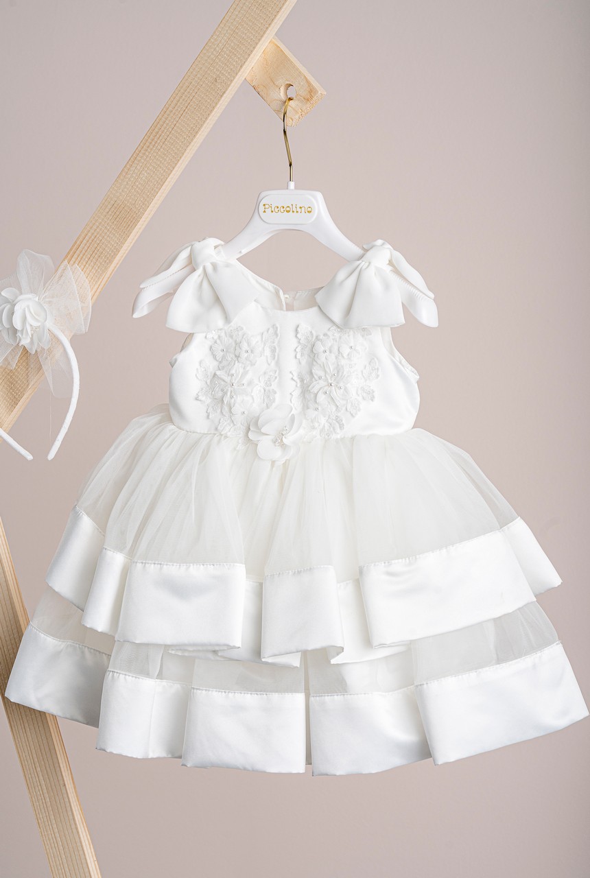 Bαπτισικό φόρεμα Piccolino Elisabeth Ivory. Εντυπωσιακό φόρεμα με μπούστο από σατέν. Στο φόρεμα ξεχωρίζουν οι εντυπωσιακοί φιόγκοι στους ώμους και η φούστα με βολάν δύο επιπέδων από τούλι και σατέν . Το ντεκόρ του φορέματος αποτελείται από μοτίφ δαντέλας και από χειροποίητο λουλούδι . Το φόρεμα συνοδέυεται απο στέκα με ντεκόρ όμοιο με το φόρεμα. Διαθέσιμο σε 4 μεγέθη: 6-12, 12-18, 18-24, 24-36 (εξτρά χρέωση)