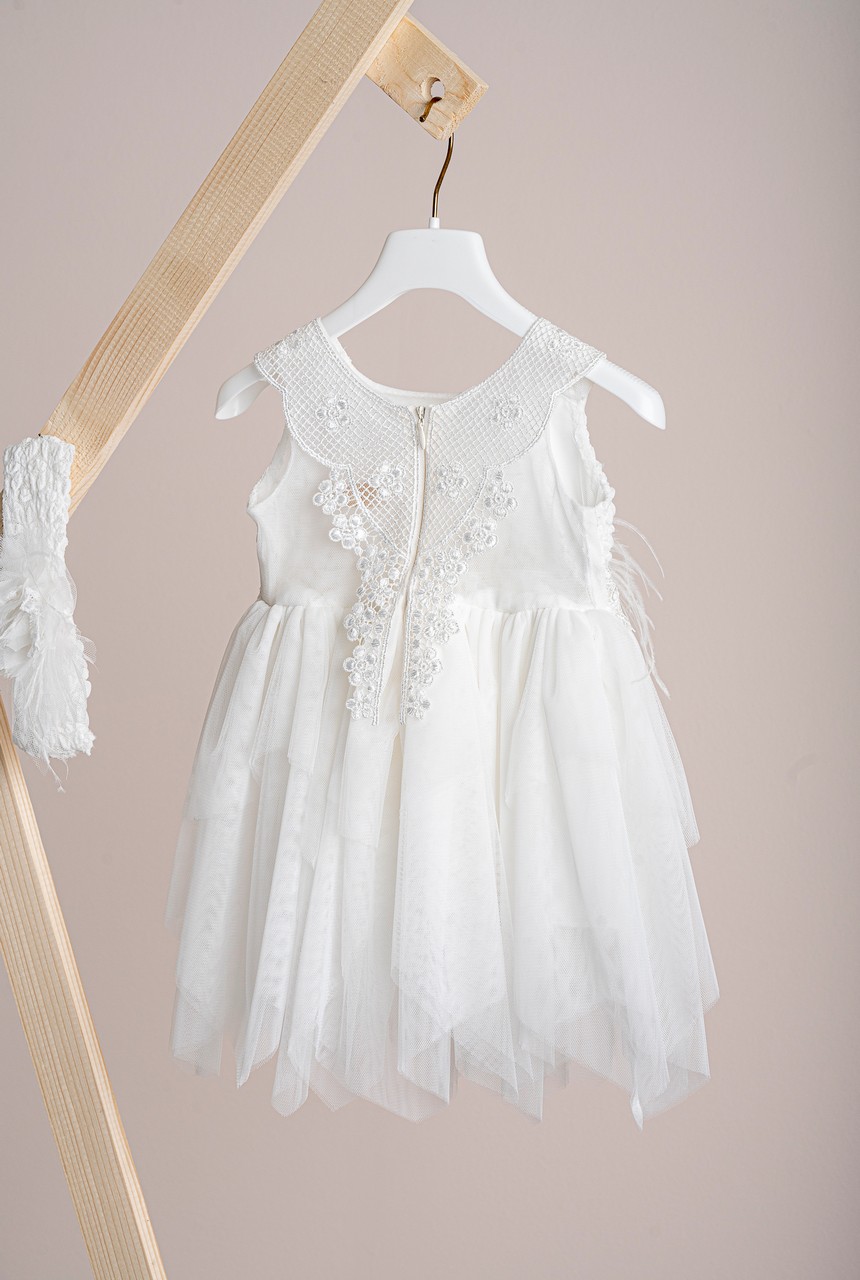 Βαπτιστικό φόρεμα Piccolino Elisa Ivory. Φόρεμα με ιδιάιτερο ύφασμα με σχέδιο στο μπούστο, δαντέλα ζωνάκι στη μέση και ασσύμετρη τούλινη φούστα . Στο φόρεμα ξεχωρίζει η εντυπώσιακή πλάτη όπου ξέκινώντας από τους ώμους αυτή η εντυπωσιακή δαντέλα καταλήγει εώς πίσω χαμηλά στην μέση .Το ντεκόρ του φορέματος αποτελείται από χειροποίητο λουλούδι με μαραμπού και στρας swarovski. Το φόρεμα συνοδέυεται απο κορδέλα με ντεκόρ όμοιο με το φόρεμα. Διαθέσιμο σε 4 μεγέθη: 6-12, 12-18, 18-24, 24-36 (εξτρά χρέωση)