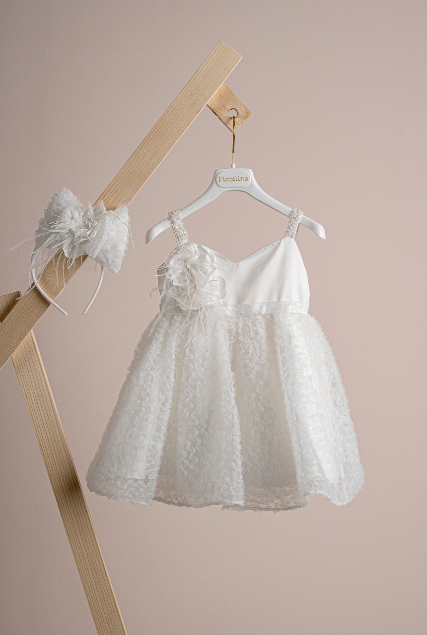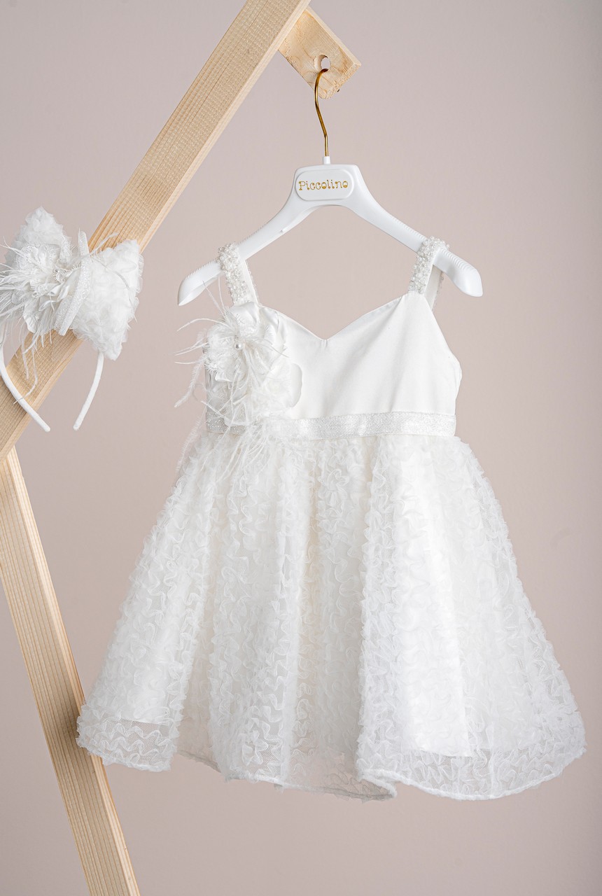 Bαπτισικό φόρεμα Piccolino Emily Ivory. Μπούστο από σατέν σε σχήμα καρδιάς, αστραφτερές τιράντες με στρας και ζωνάκι με γκλίτερ. Εντυπωσιακή φούστα από τούλι με σχέδια . Το ντεκόρ του φορέματος αποτελείται από χειροποίητο λουλούδι και πούπουλα. Το φόρεμα συνοδέυεται απο στέκα με ντεκόρ όμοιο με το φόρεμα. Διαθέσιμο σε 4 μεγέθη: 6-12, 12-18, 18-24, 24-36 (εξτρά χρέωση)
