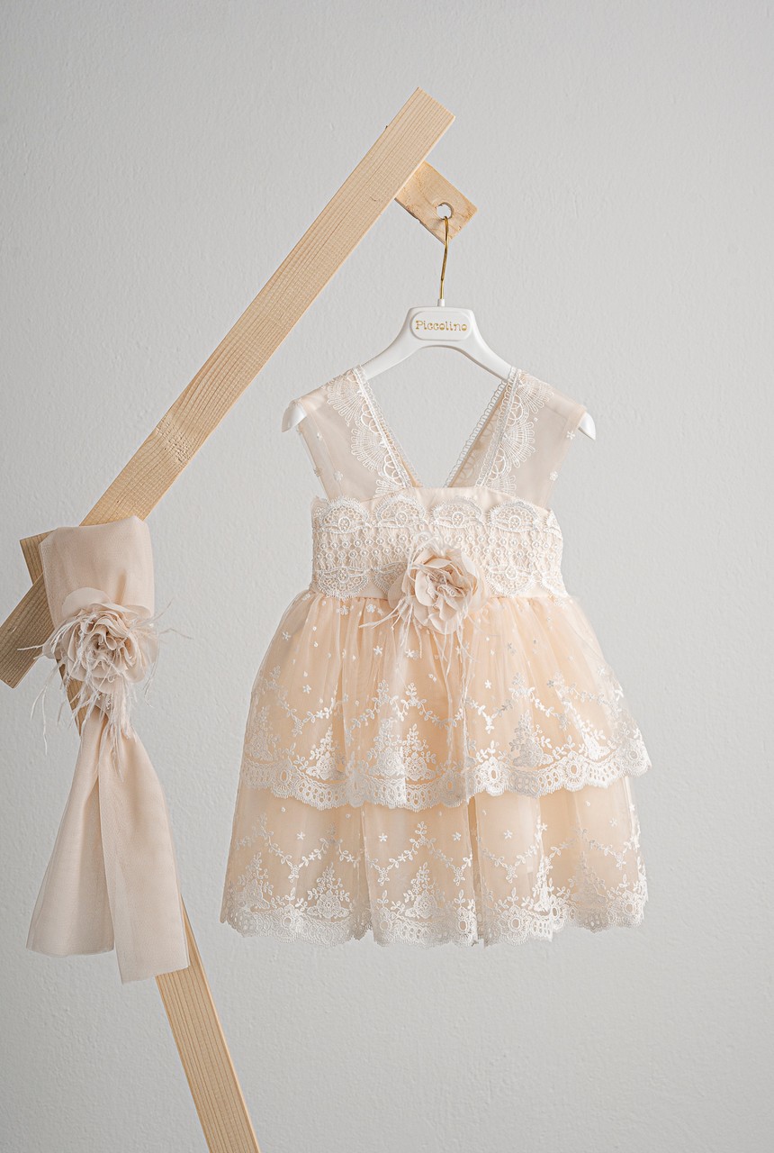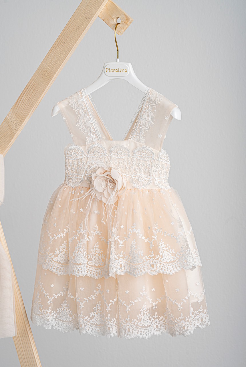 Βαπτιστικό φόρεμα Piccolino Estelle Champagne.Ρομαντικό φόρεμα με μπούστο από δαντέλα, τιράντες από τούλι και δαντέλα και φούστα δύο επιπέδων με δαντέλα με όμορφο τελείωμα. Πλάτη σε σχήμα V με δαντέλα και φιόγκο. Το ντεκόρ του φορέματος αποτελείται απο χειροποίητο λουλούδι. Το φόρεμα συνοδέυεται απο μπαντάνα με ντεκόρ όμοιο με το φόρεμα. Διαθέσιμο σε 4 μεγέθη: 6-12, 12-18, 18-24, 24-36 (εξτρά χρέωση)