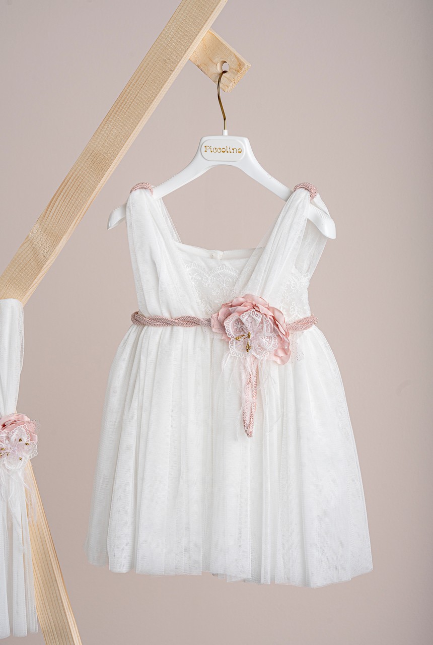 Βαπτιστικό φόρεμα Piccolino Lydia Pink .Φόρεμα σε αρχαιοελληνικό στυλ, με μπούστο απο δαντέλα και σχέδιο από τούλι που ξεκινά από τους ώμους και καταλήγει στη μέση, με ζωνάκι πλεξούδα σε ροζ απόχωση και τούλινη φούστα. Το ντεκόρ του φορέματος αποτελείται απο εντυπωσιάκο χειροποίητο λουλούδι με δαντέλα και μαραμπού . Το φόρεμα συνοδέυεται απο μπαντάνα με ντεκόρ όμοιο με το φόρεμα. Διαθέσιμο σε 4 μεγέθη: 6-12, 12-18, 18-24, 24-36 (εξτρά χρέωση)