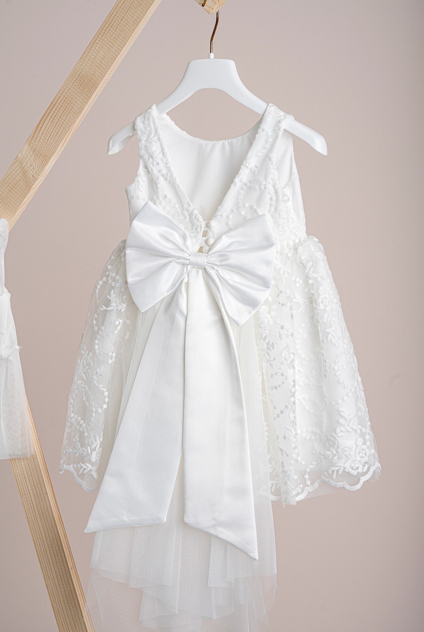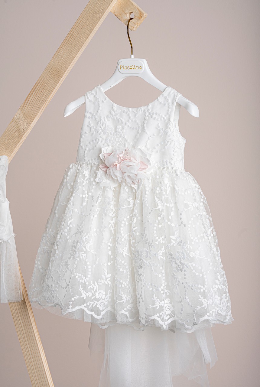 Βαπτιστικό φόρεμα Piccolino Michele Ivory, Φόρεμα απο δαντέλα με όμορφο τελείωμα στο κάτω μέρος, η εντυπωσιακή του πλάτη καταλήγει σε V και την διακοσμεί ένας σατέν φιόγκος κάτω από τον οποίο υπάρχει μία τούλινη ΄΄ουρά΄΄. Το ντεκόρ του φορέματος αποτελείται απο χειροποίητα λουλούδια. Το φόρεμα συνοδέυεται απο κορδέλα με ντεκόρ όμοιο με το φόρεμα. Διαθέσιμο σε 4 μεγέθη: 6-12, 12-18, 18-24, 24-36 (εξτρά χρέωση)