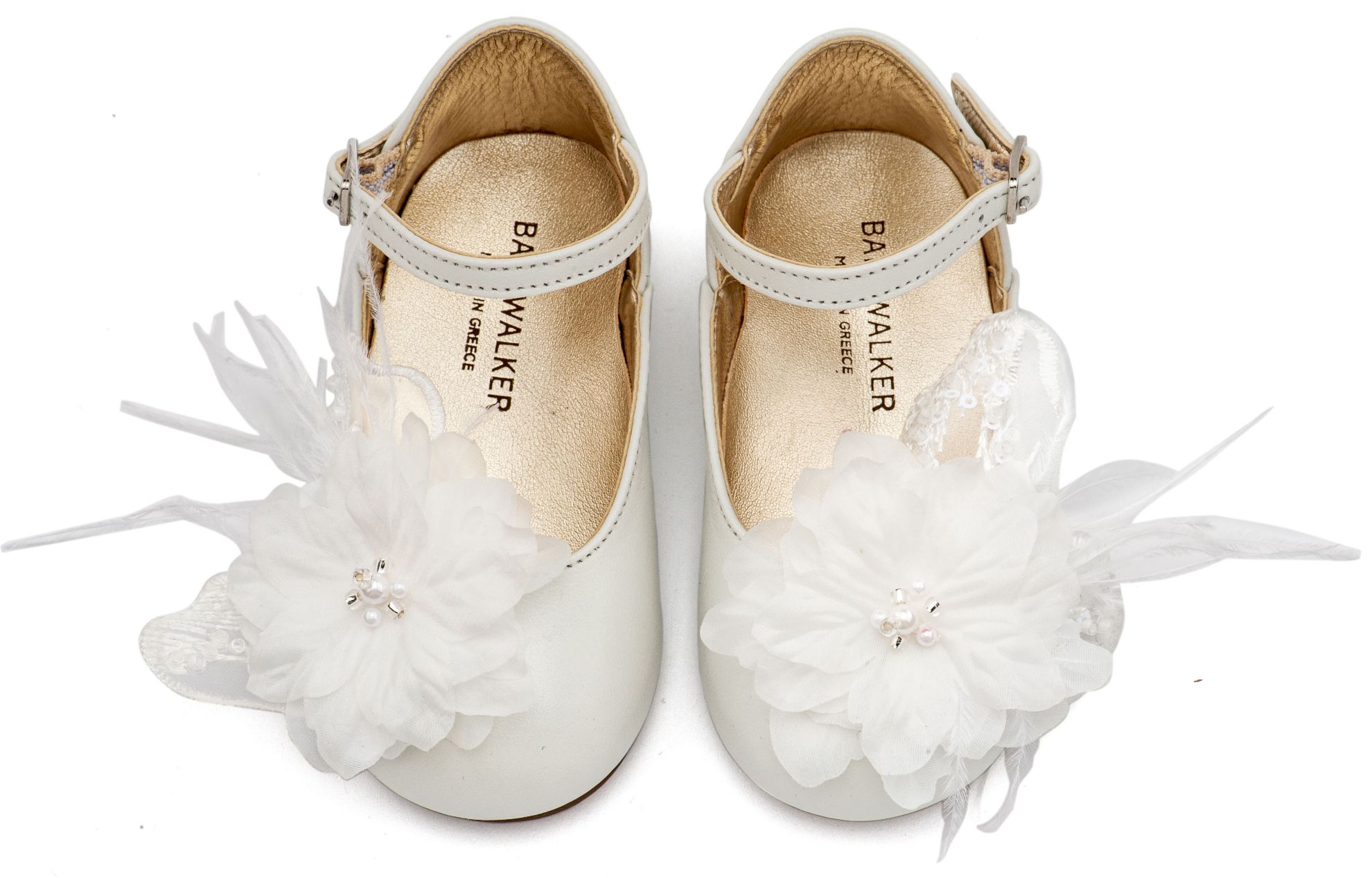 Δερμάτινο Γαλλικό Γοβάκι με Χειροποίητο Chiffon Λουλούδι και Πούπουλα σε Εκρού Χρώμα