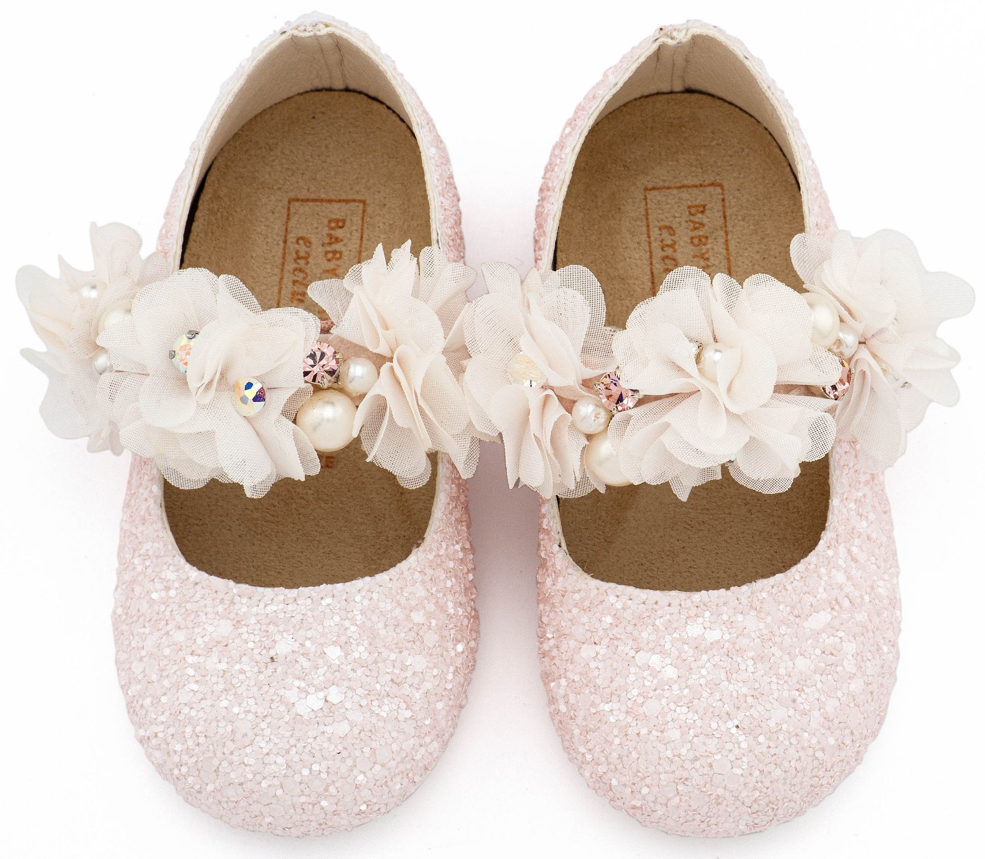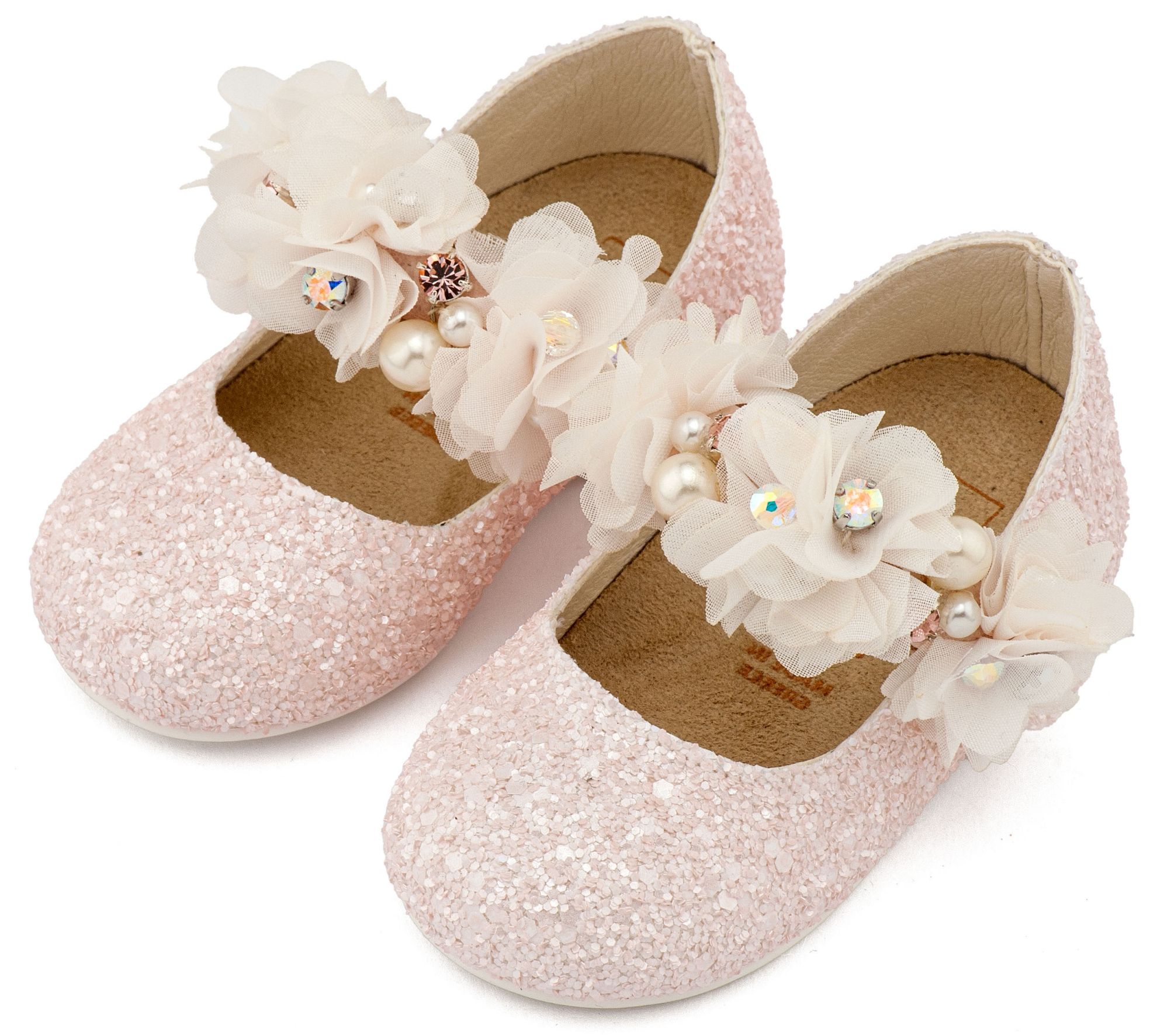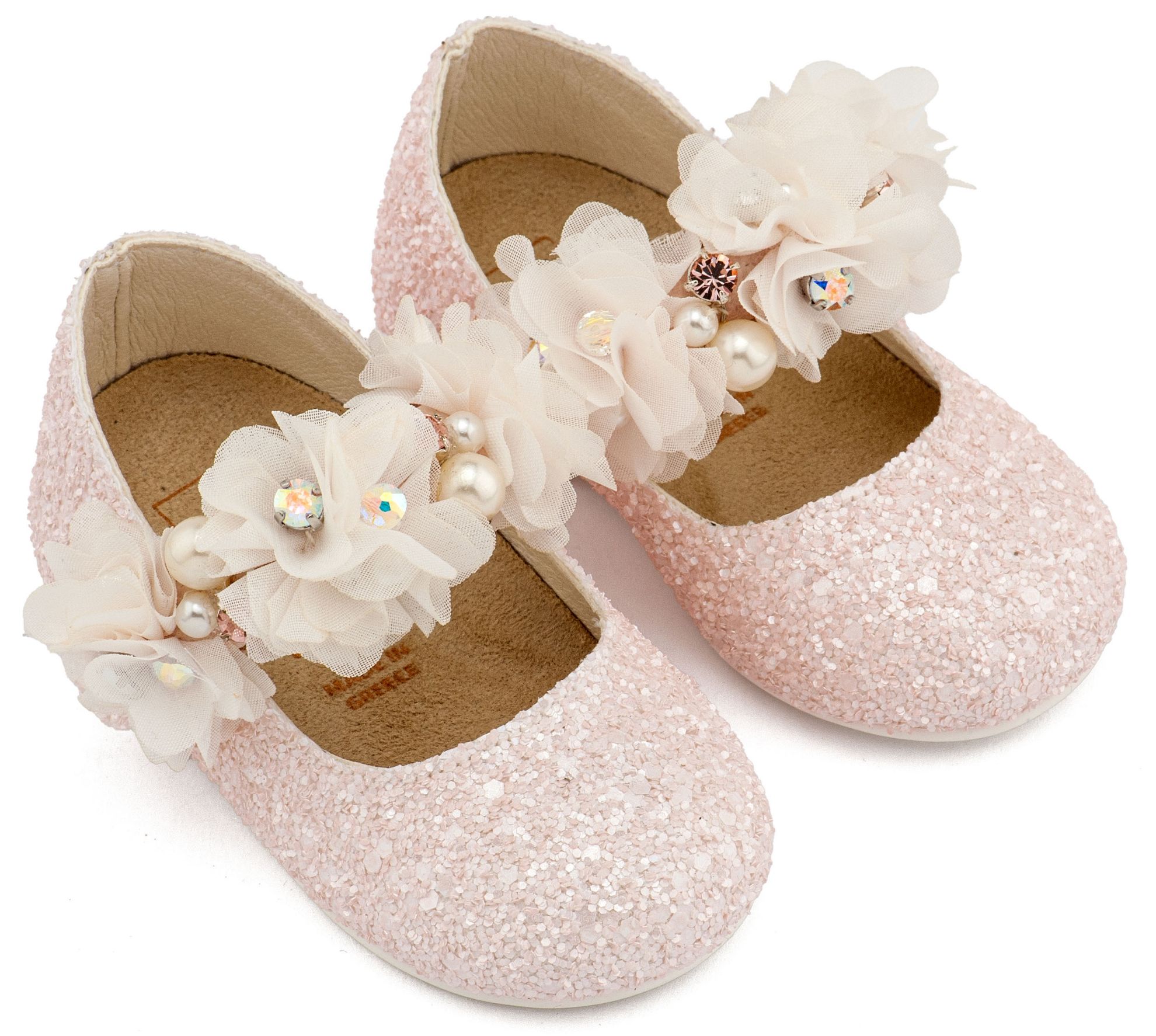 Υφασμάτινο Glitter Γοβάκι Μονή Μπαρέτα Στρας με Λουλούδια Πέρλες και Κρύσταλα Swarovski σε Ροζ Χρώμα