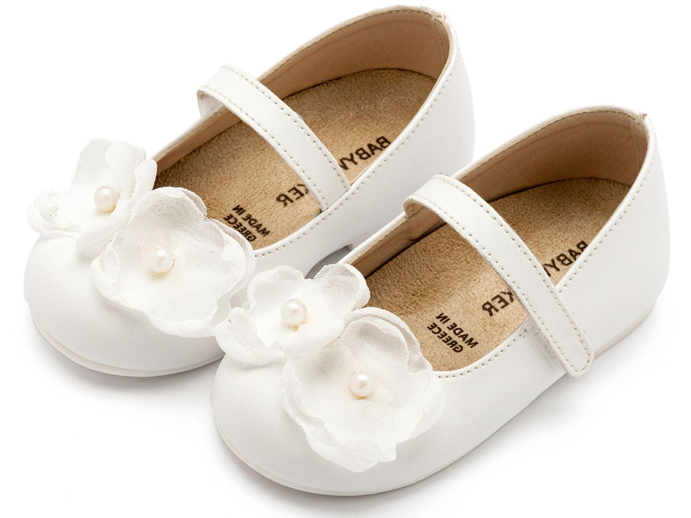 Δερμάτινο Γοβάκι Μονή Μπαρέτα Χρατς με Υφασμάτινα Χειροποίητα Λουλούδια Οργάντζας και Πέρλα σε Λευκό Χρώμα