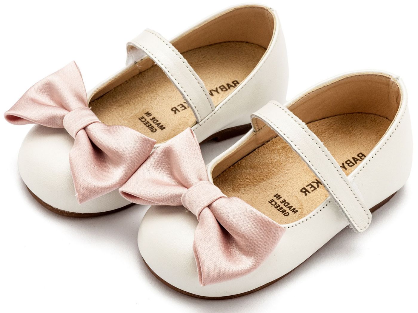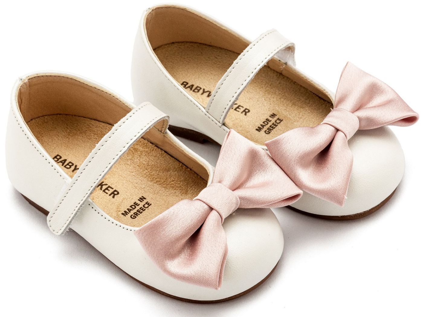 Δερμάτινο Γοβάκι Μονή Μπαρέτα Χρατς με Σατέν Χειροποίητο Φιογκάκι σε Εκρού Ροζ Χρώμα