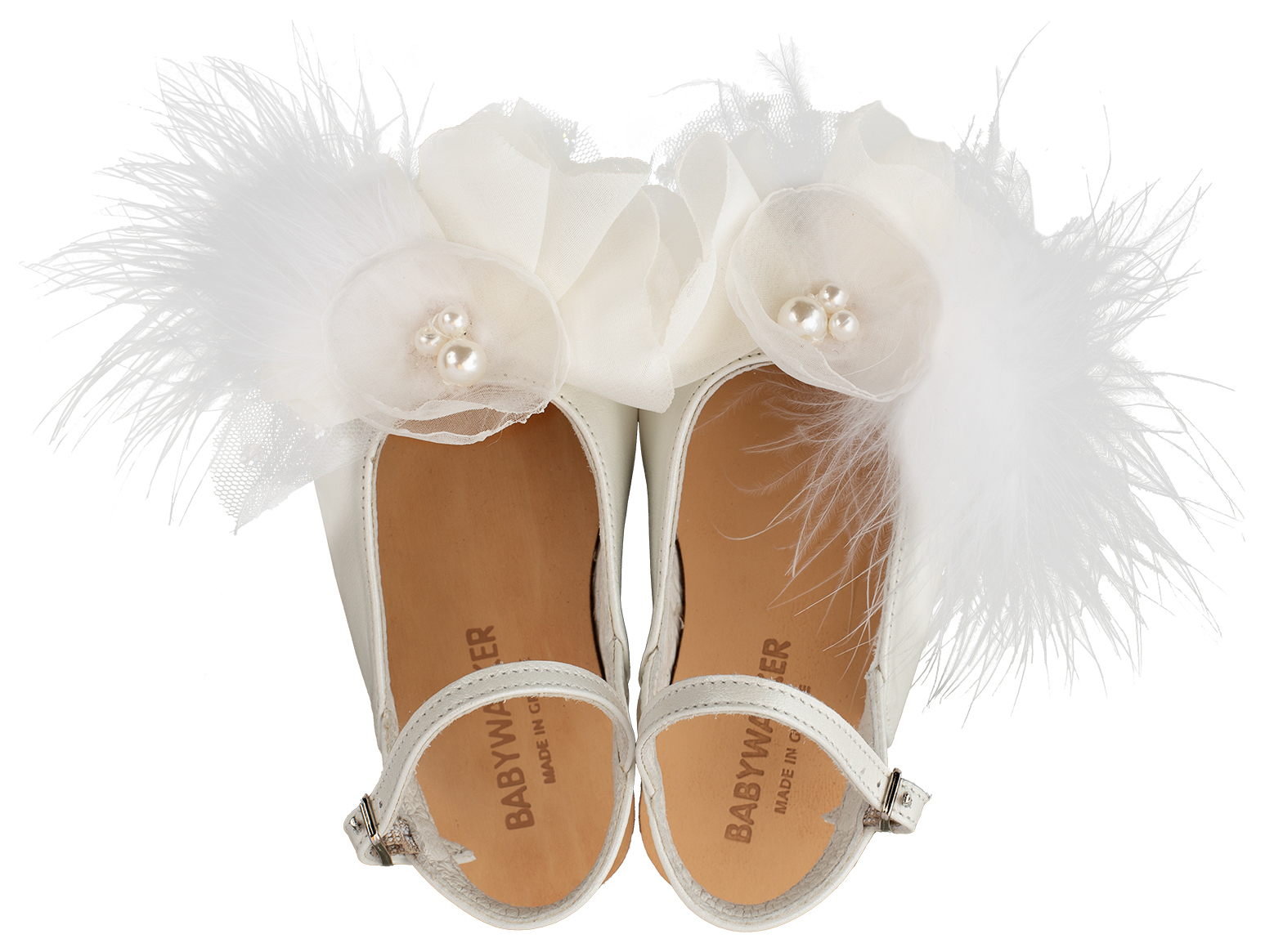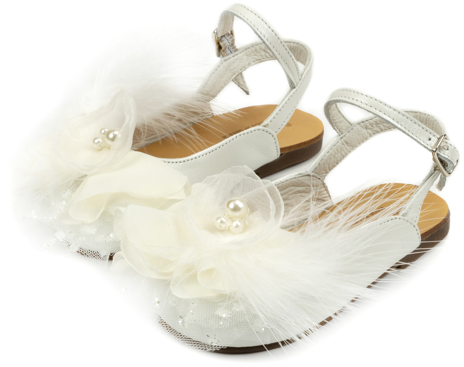 Δερμάτινο Σαμπό Διακοσμημένο με Χειροποίητο Chiffon Λουλούδι και Πούπουλα από Δέρμα Πέρλα σε Εκρού Χρώμα