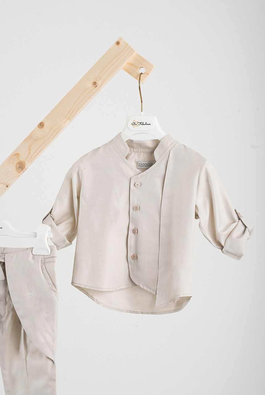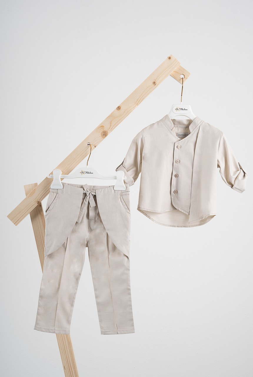 Κοστούμι Piccolino Josua σε χρώμα Beige. Περιλαμβάνει βισκόζη πουκαμίσα σε ιδιαίτερο κόψιμο με πιέτα, παντελόνι βισκόζη μέ ένα εξίσου ιδιαίτερο κόψιμο και ζωνάκι. Διαθέσιμο σε 4 μεγέθη 6-12, 12-18, 18-24, 24-36 (εξτρά χρέωση)