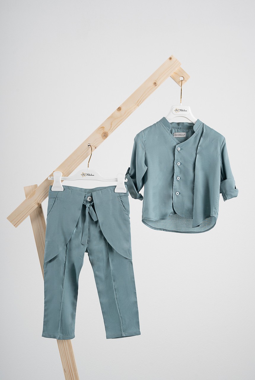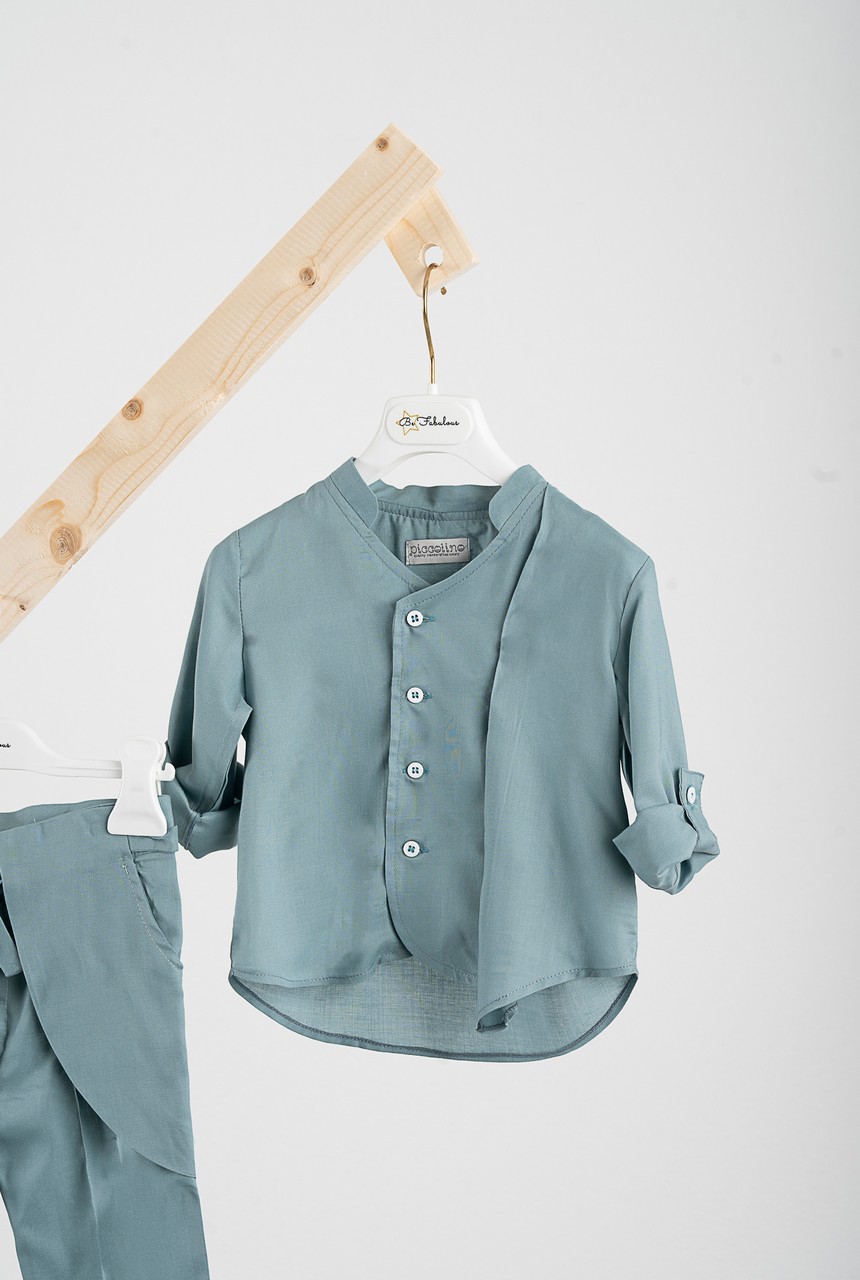 Κοστούμι Piccolino Josua σε χρώμα Mint. Περιλαμβάνει βισκόζη πουκαμίσα σε ιδιαίτερο κόψιμο με πιέτα, παντελόνι βισκόζη μέ ένα εξίσου ιδιαίτερο κόψιμο και ζωνάκι. Διαθέσιμο σε 4 μεγέθη 6-12, 12-18, 18-24, 24-36 (εξτρά χρέωση)