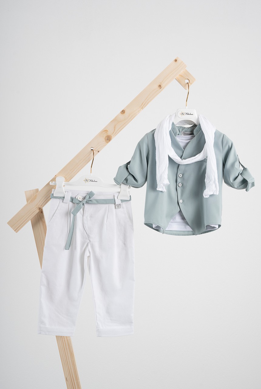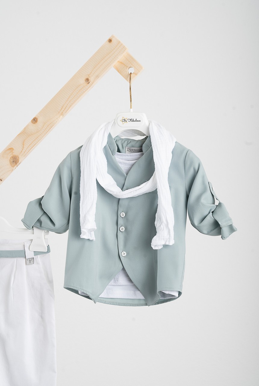 Κοστούμι Piccolino Max σε χρώμα Mint. Περιλαμβάνει βισκόζη πουκαμίσα καμπυλωτή, βαμβακερό λευκό μπλουζάκι, παντελόνι λινό βράκα με πιέτες λευκό, ζωνάκι και φουλάρι. Διαθέσιμο σε 4 μεγέθη 6-12, 12-18, 18-24, 24-36 (εξτρά χρέωση)