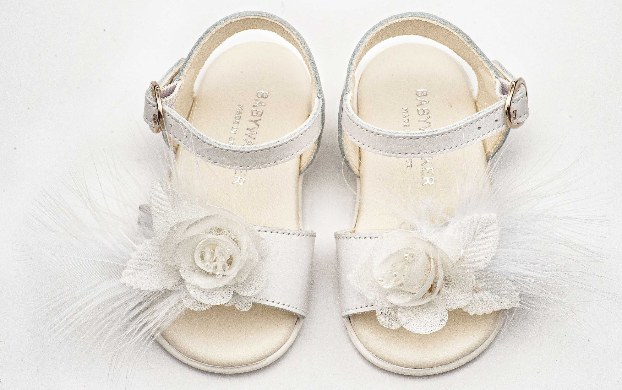 Δερμάτινο Πέδιλο Διακοσμημένο με Χειροποίητο Λουλούδι με Πούπουλα σε Λευκό Χρώμα