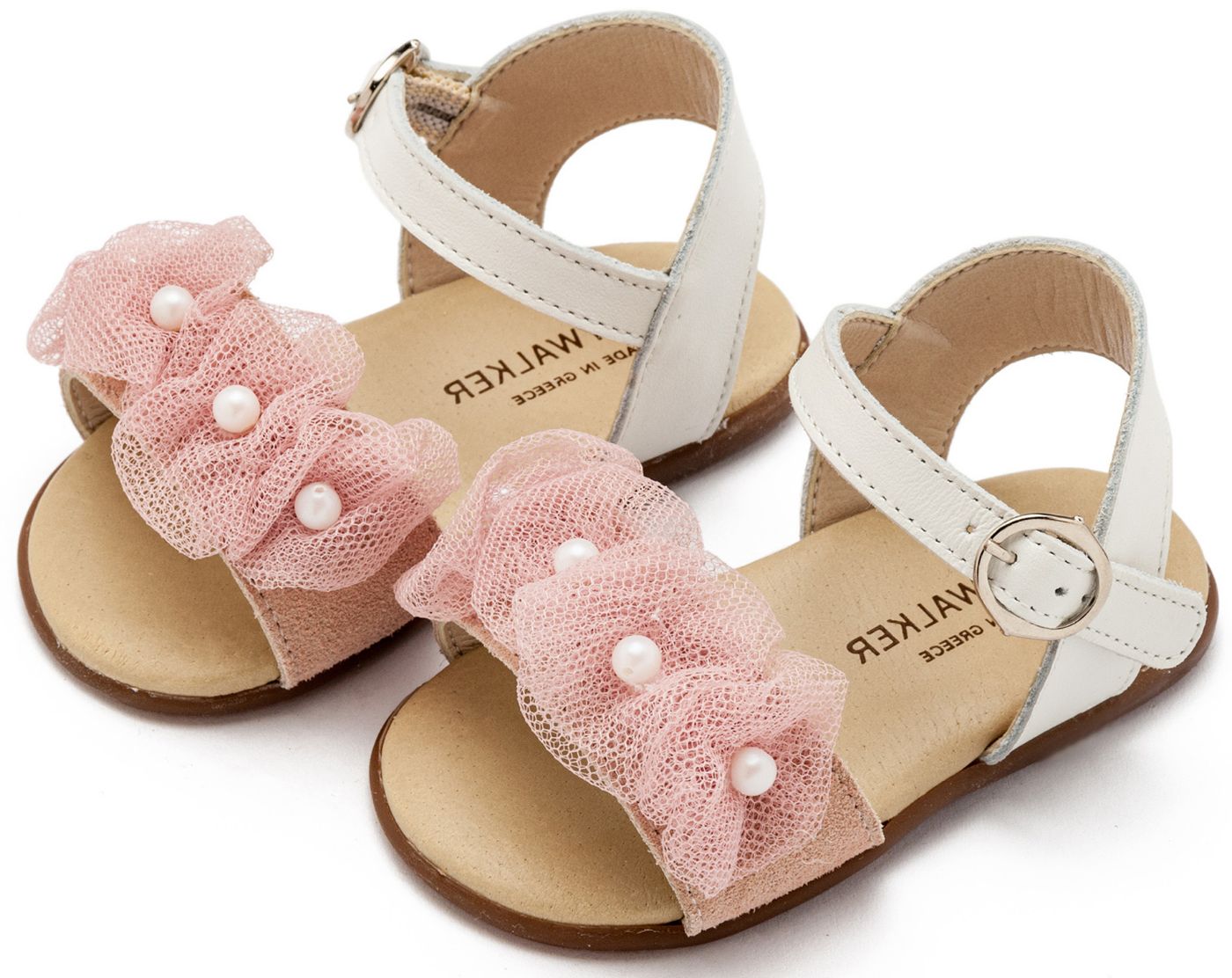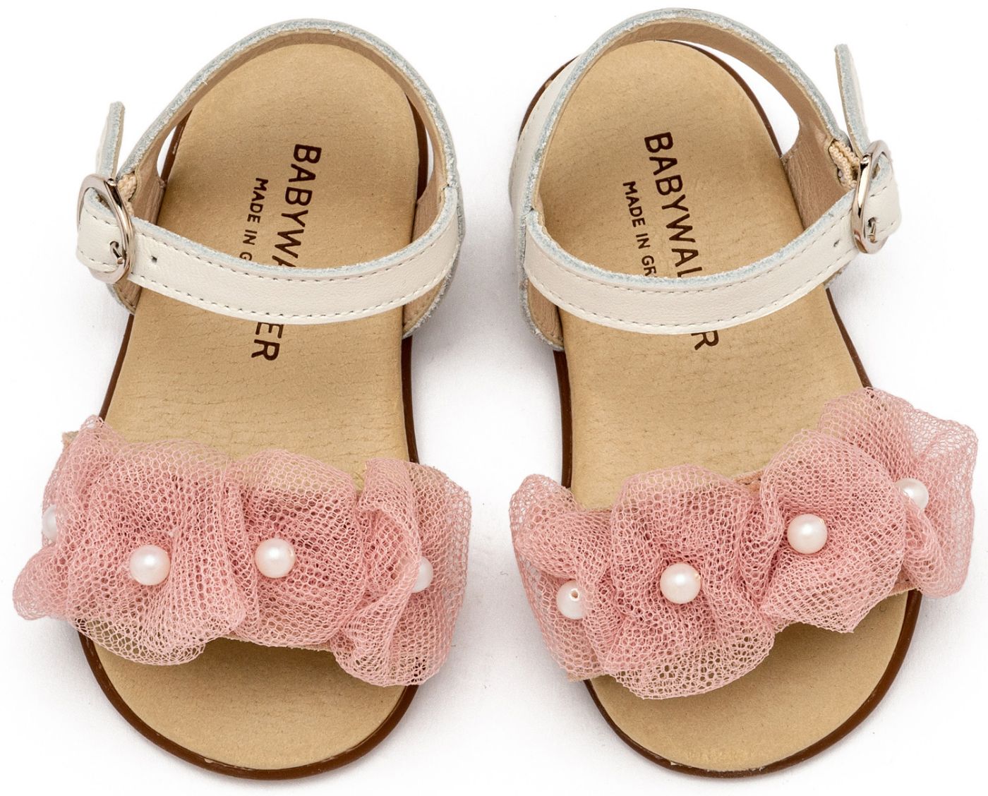 Δερμάτινο Πέδιλο Διακοσμημένο με Τούλινα Λουλουδάκια και Πέρλες από Δέρμα Πέρλα σε Εκρού Ροζ Χρώμα