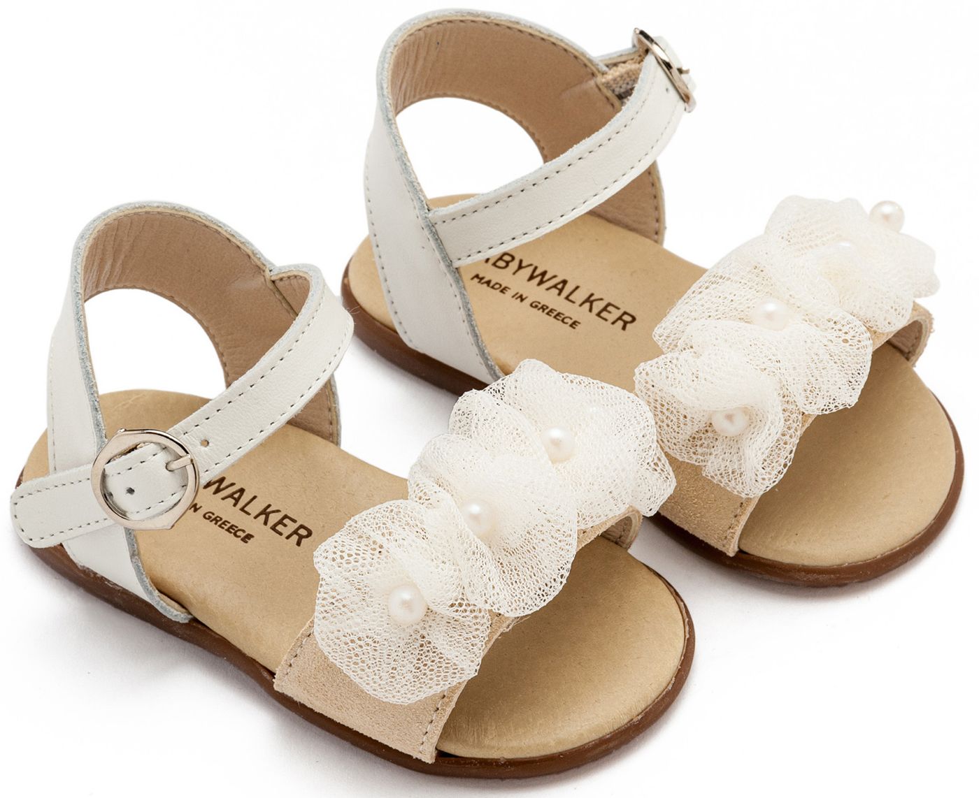 Δερμάτινο Πέδιλο Διακοσμημένο με Τούλινα Λουλουδάκια και Πέρλες από Δέρμα Πέρλα σε Εκρού Χρώμα