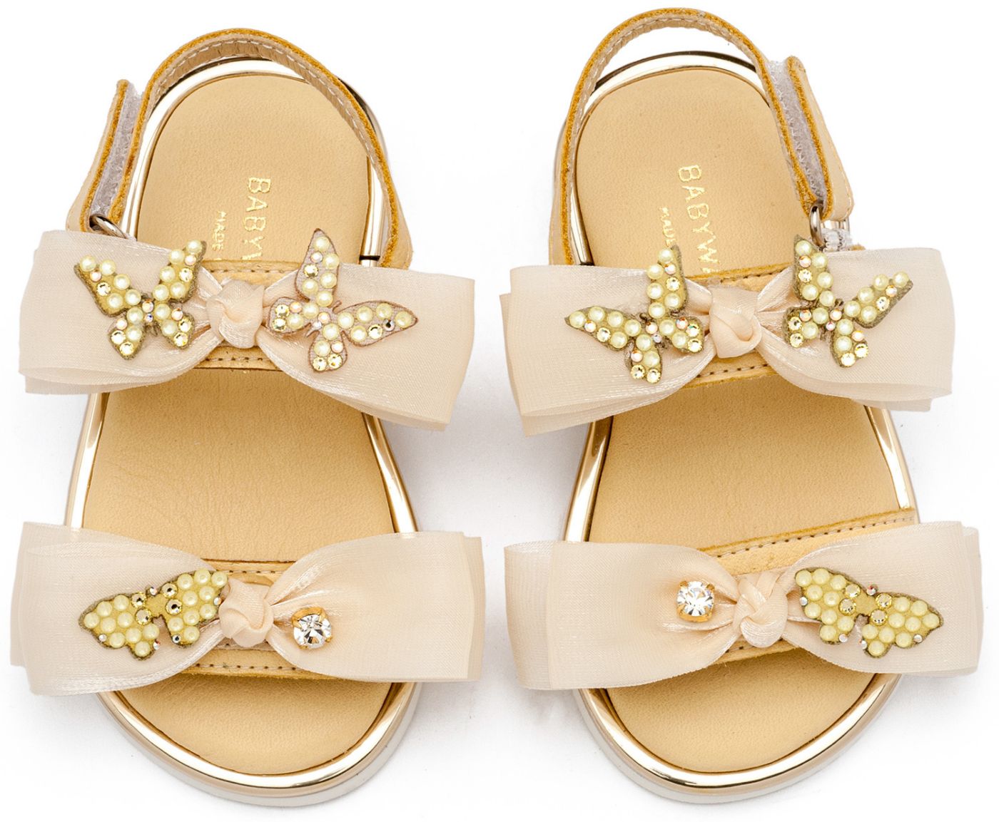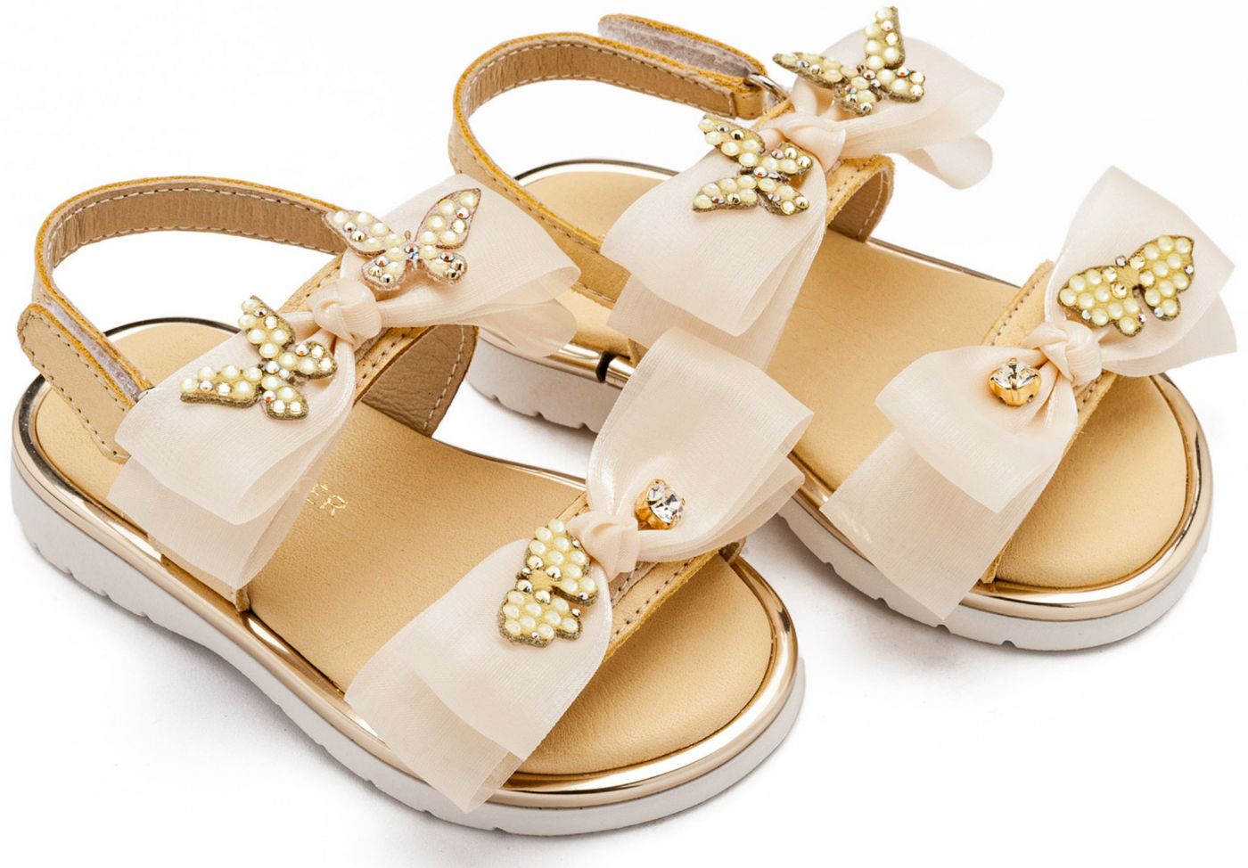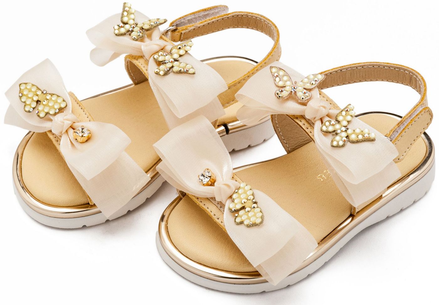 Δερμάτινο Πέδιλο με Φιόγκους Οργάντζας και Πεταλούδες Swarovski σε Κίτρινο Χρώμα