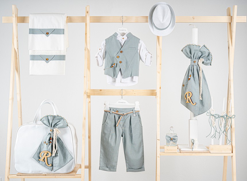 Βαπτιστικό πακέτο Piccolino Enrique teal περιλαμβάνει κοστούμι ,σετ λαδόπανα, λαμπάδα, λαδοσετ και στολισμένη τσάντα λευκή
