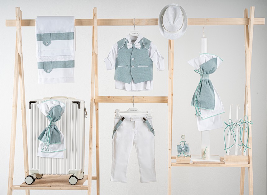 Βαπτιστικό πακέτο Piccolino Francisco mint white περιλαμβάνει κοστούμι ,σετ λαδόπανα, λαμπάδα, λαδοσετ και στολισμένη βαλίτσα white