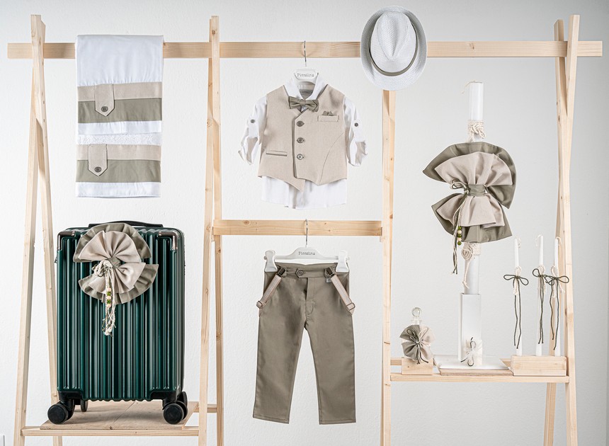 Βαπτιστικό πακέτο Piccolino Gustavo sage περιλαμβάνει κοστούμι ,σετ λαδόπανα, λαμπάδα, λαδοσετ και στολισμένη βαλίτσα green