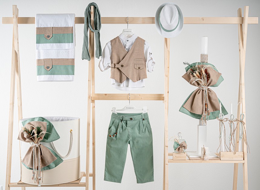 Βαπτιστικό πακέτο Piccolino Jose mint περιλαμβάνει κοστούμι ,σετ λαδόπανα, λαμπάδα, λαδοσετ και στολισμένο καλάθι