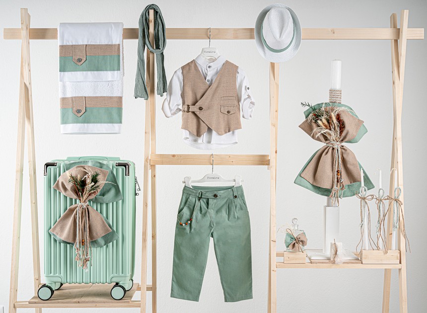 Βαπτιστικό πακέτο Piccolino Jose mint περιλαμβάνει κοστούμι ,σετ λαδόπανα, λαμπάδα, λαδοσετ και στολισμένη βαλίτσα mint