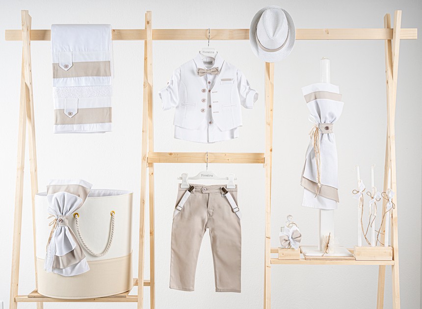 Βαπτιστικό πακέτο Piccolino Lorenzo sand περιλαμβάνει κοστούμι ,σετ λαδόπανα, λαμπάδα, λαδοσετ και στολισμένο καλάθι