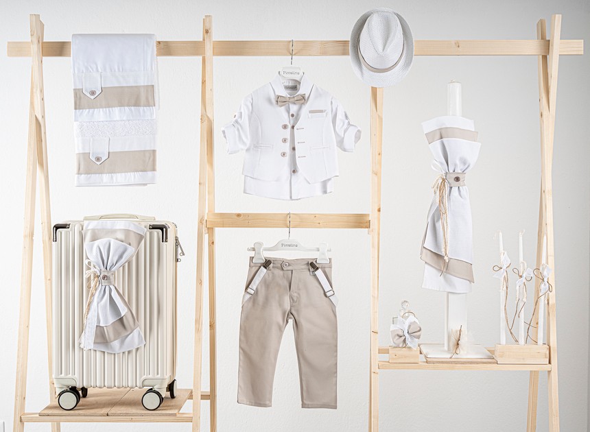 Βαπτιστικό πακέτο Piccolino Lorenzo sand περιλαμβάνει κοστούμι ,σετ λαδόπανα, λαμπάδα, λαδοσετ και στολισμένη βαλίτσα CREAM