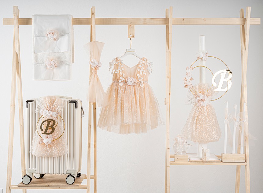 Βαπτιστικό πακέτο Piccolino Filomena salmon περιλαμβάνει φόρεμα ,σετ λαδόπανα, λαμπάδα, λαδοσετ και στολισμένη βαλίτσα ecru