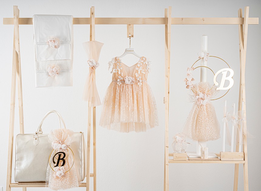 Βαπτιστικό πακέτο Piccolino Filomena περιλαμβάνει φόρεμα ,σετ λαδόπανα, λαμπάδα, λαδοσετ και στολισμένη τσάντα ivory