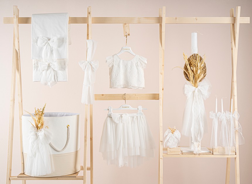 Βαπτιστικό πακέτο Piccolino Isabelle ivory περιλαμβάνει φόρεμα ,σετ λαδόπανα, λαμπάδα, λαδοσετ και στολισμένo καλάθι