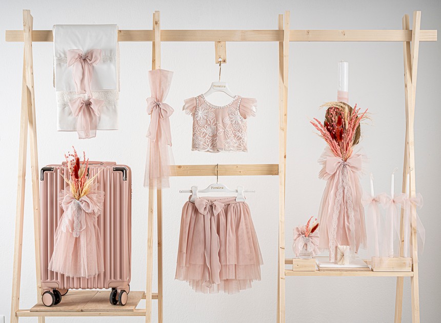 Βαπτιστικό πακέτο Piccolino Isabelle powder περιλαμβάνει φόρεμα ,σετ λαδόπανα, λαμπάδα, λαδοσετ και στολισμένη βαλίτσα pink
